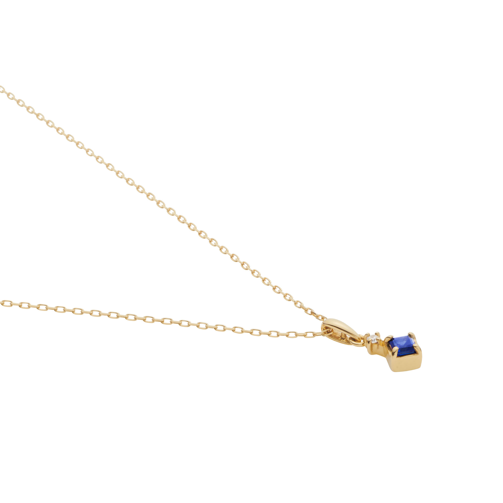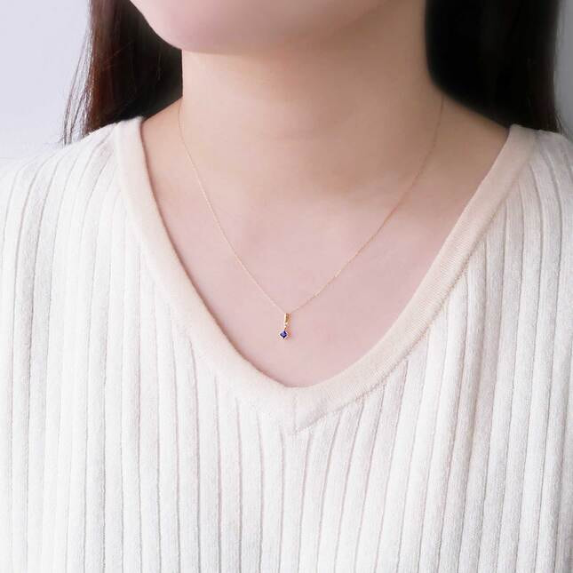 すっきりとしたバチカンの下にきらめくスクエアシェイプのサファイアが印象的なネックレス。
