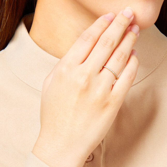 シンプルな一本使いはもちろん、お手持ちのリングと重ね着けすれば輝きが増して、より華やかな手元に。
