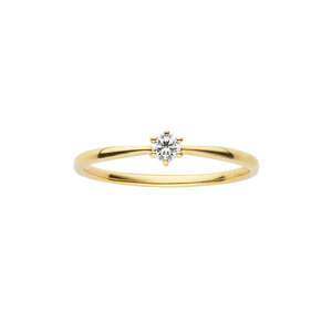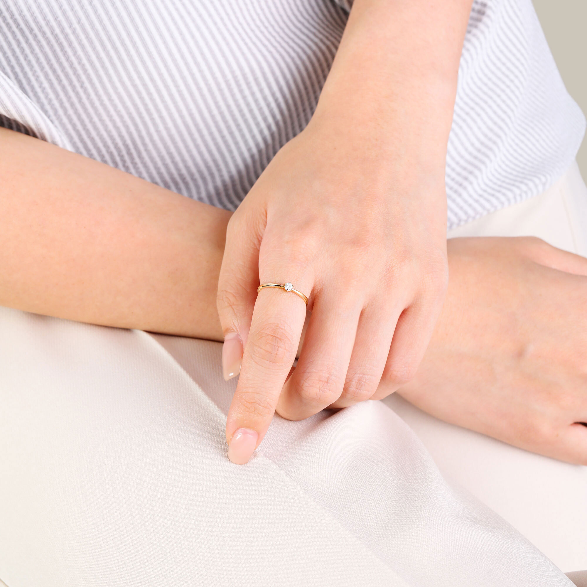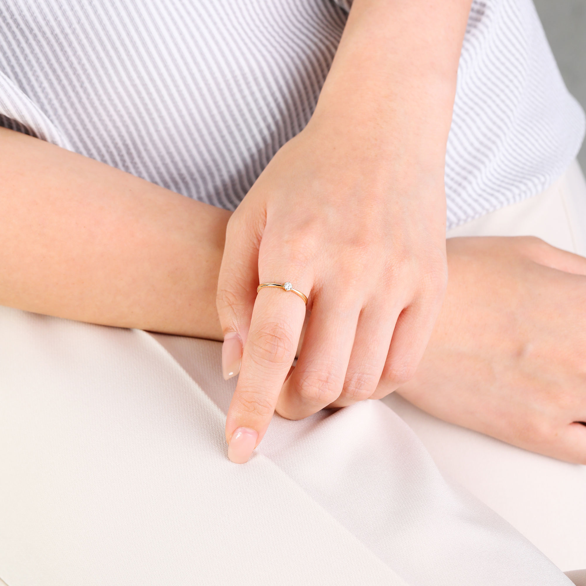 星の瞬きのようにきらめく、一粒ダイヤモンドのリング。ダイヤモンドに向かってきゅっと絞られたデザインが、繊細な雰囲気です。