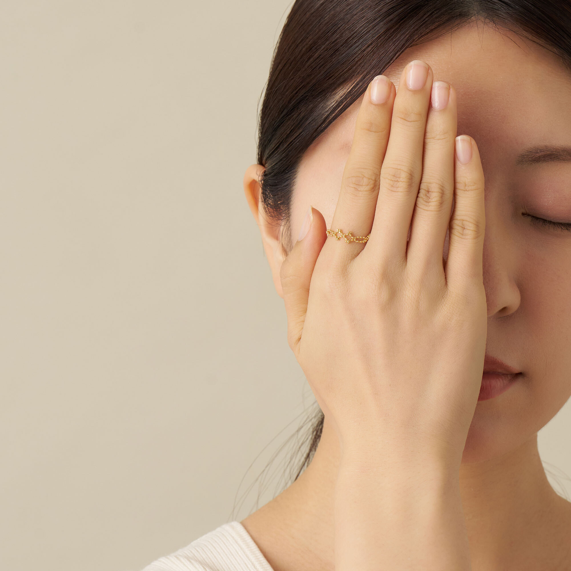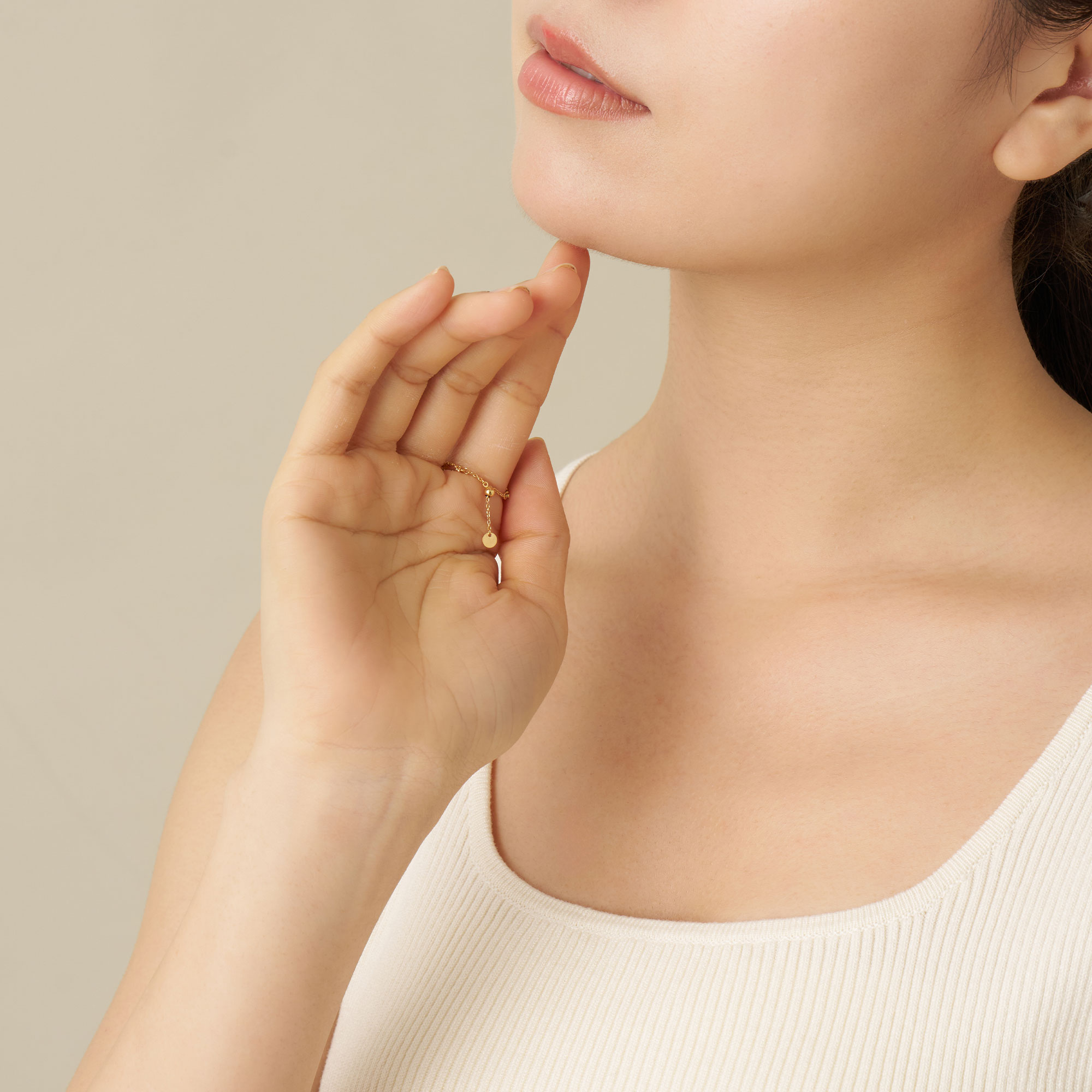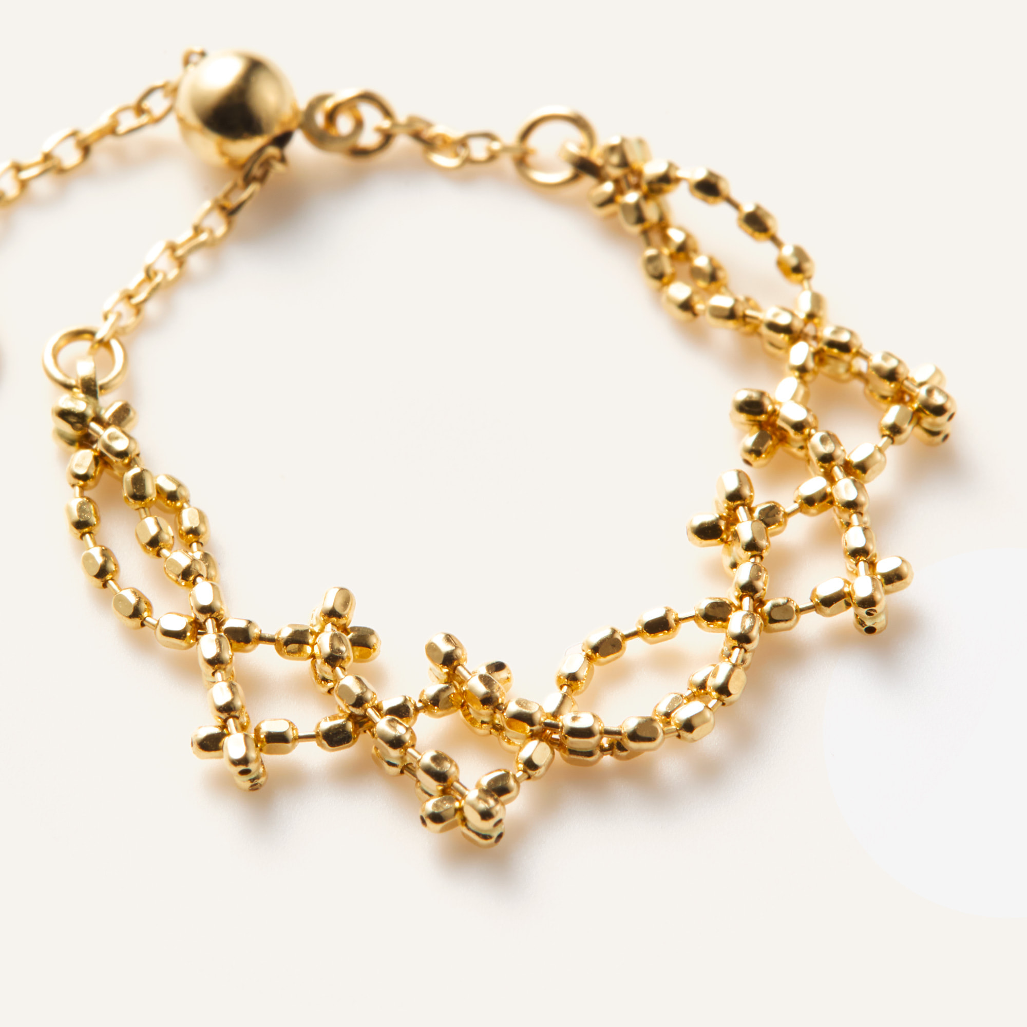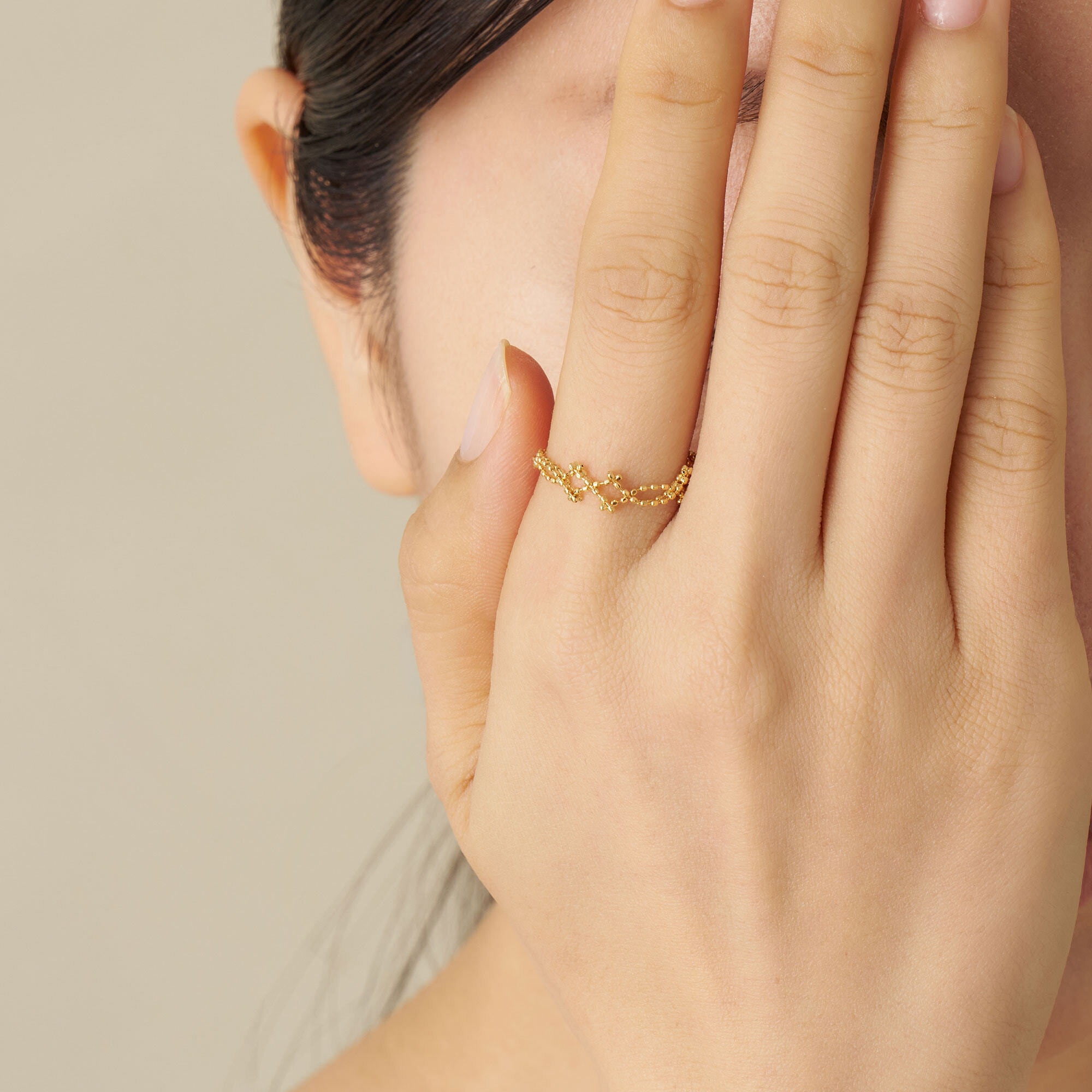 ボールチェーンで形作られたリングは、サラサラとした柔らかな手触りとフィット感が魅力。