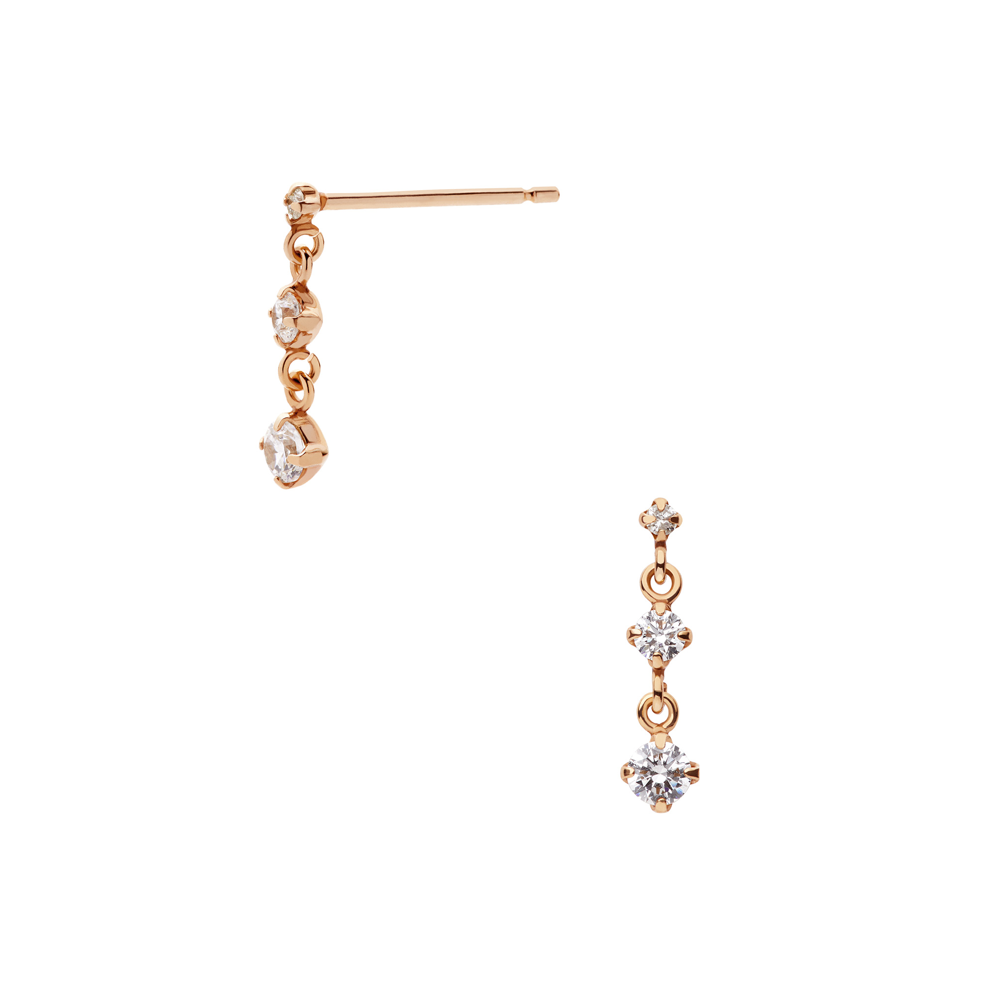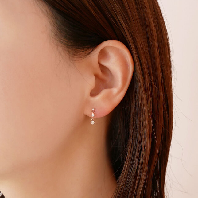 ポスト部分にはダイヤモンドがあしらわれ、その下に揺れるキュービックジルコニア2石が下に向かってグラデーションを描くピアス。