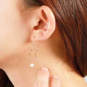 ゆるくひねった光沢ある金線の先に、淡水パールが揺れるロングピアス。