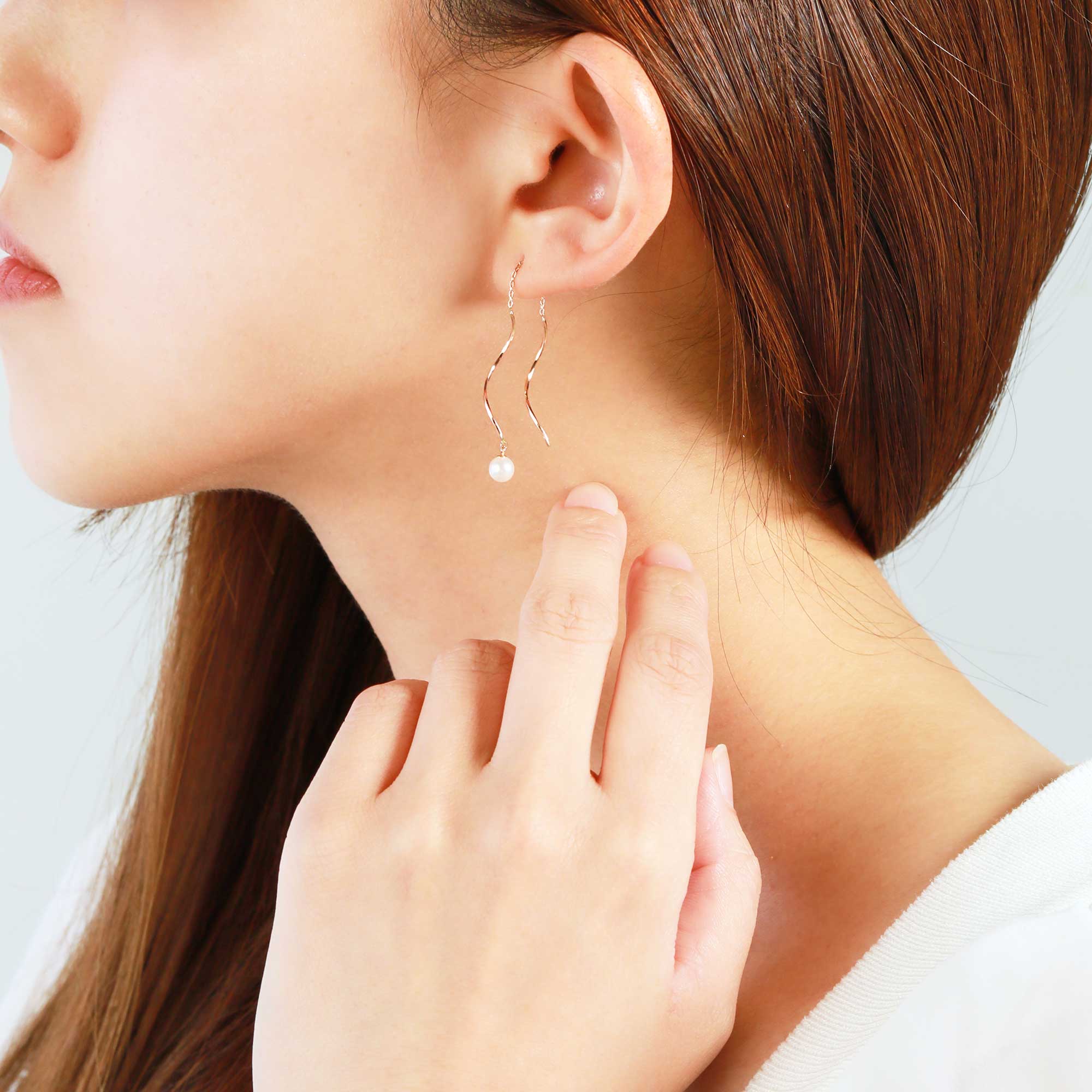 耳の後ろ側にもゆるくひねった金線が揺れるデザインで、動くたびに耳元にピンクゴールドのきらめきを放ちます。