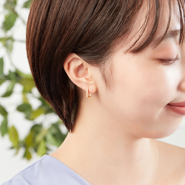 程よくボリュームのあるスクエア型のフープピアスは、スタイリッシュな印象でお使いいただけます。
