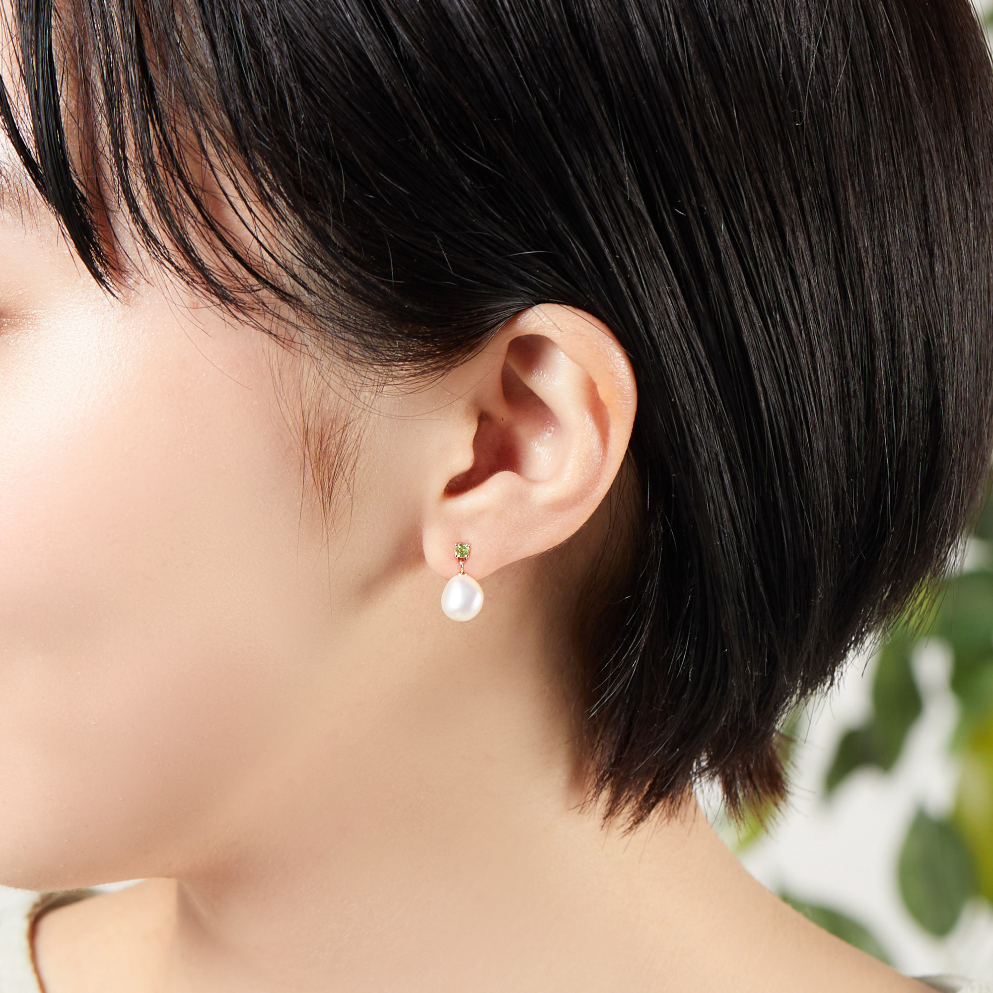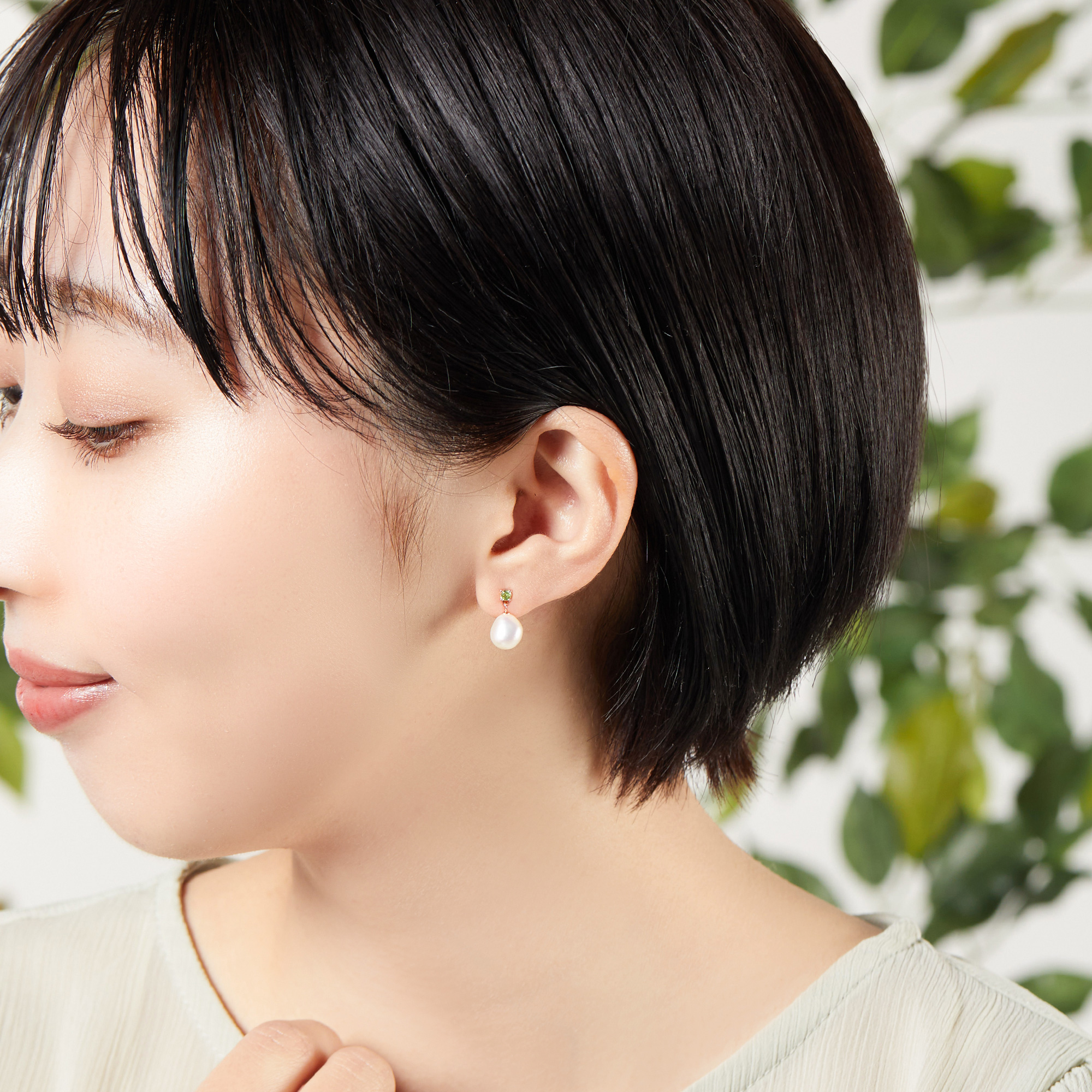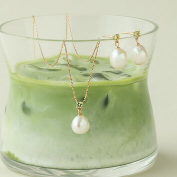 パールの上にはペリドットを合わせ、抹茶ラテのような爽やかな色の組み合わせが新鮮。