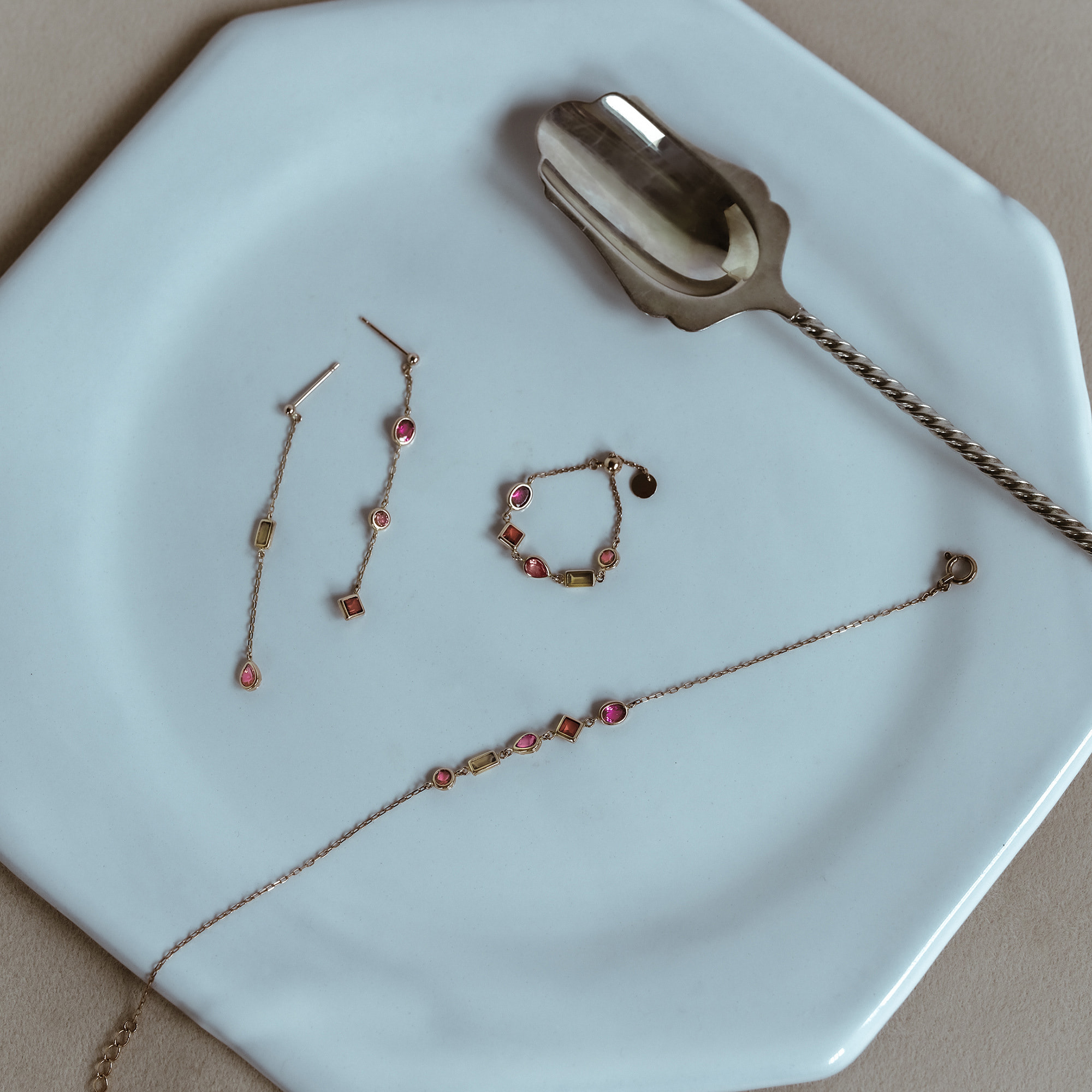 カラフルな宝石がまるでモザイクアートのようなジュエルモザイクシリーズ。 ピンクカラーが可愛らしくも大人っぽい印象のピアス。 カラーストーンは4種類をミックスし、カットも多様な組み合わせです。 カラーストーンは細いピンクゴールドのラインで囲われた石座にセッティング。 地金でキリッと縁取ることでそれぞれの石の輪郭を際立たせています。 少しシャープな印象もプラスされ、甘くなりすぎない仕上がりに。 優しげなピンクカラーは大人っぽいカラーリングで、フェミニンな雰囲気に見せてくれます。▼カラーバリエーションはこちら▼ジュエルモザイクシリーズはこちら▼1月の誕生石ガーネットのアイテムはこちら▼10月の誕生石ピンクトルマリンのアイテムはこちら