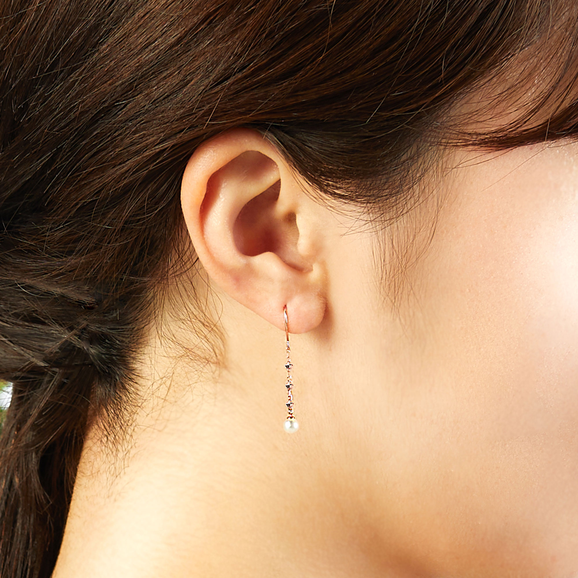 チェーンとカットパーツの繊細なきらめきとパールの柔らかな輝きが美しいピアス。
