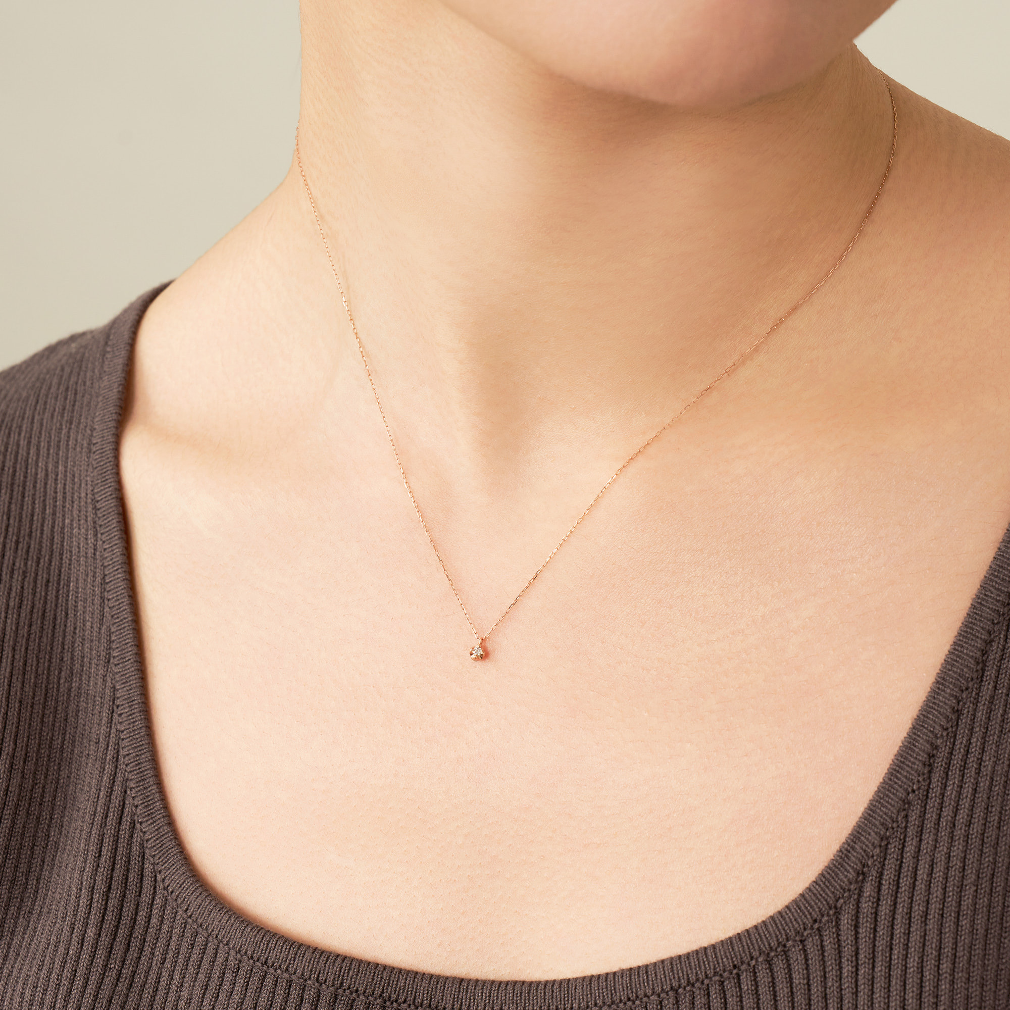 肌なじみの良いピンクゴールドの華奢なチェーンにダイヤモンドが上品でフェミニンな印象に。