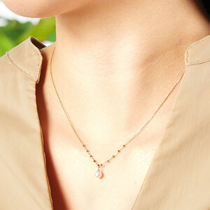 チェーンにあしらったピンクゴールドのカットパーツがパールのやわらかな輝きを引き立てながら、さりげなくきらめきをプラス。上品な胸元を演出します。