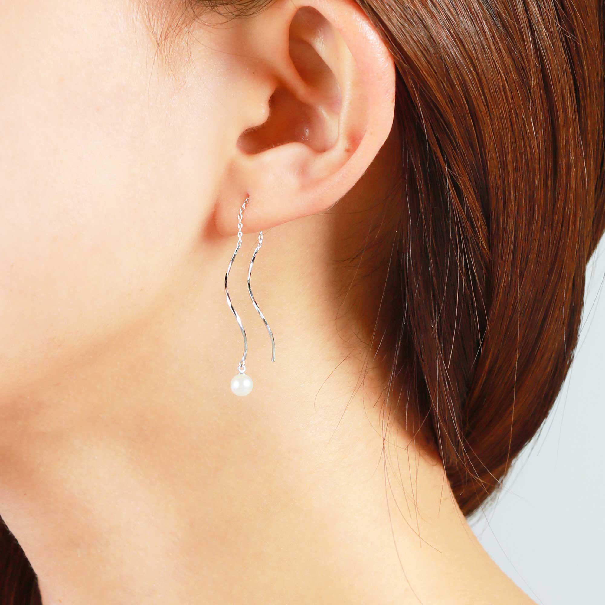 ひねりを加えたホワイトゴールドのラインと繊細なチェーンが風に踊るような空気感を演出するロングピアス。