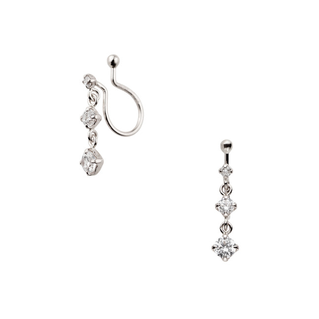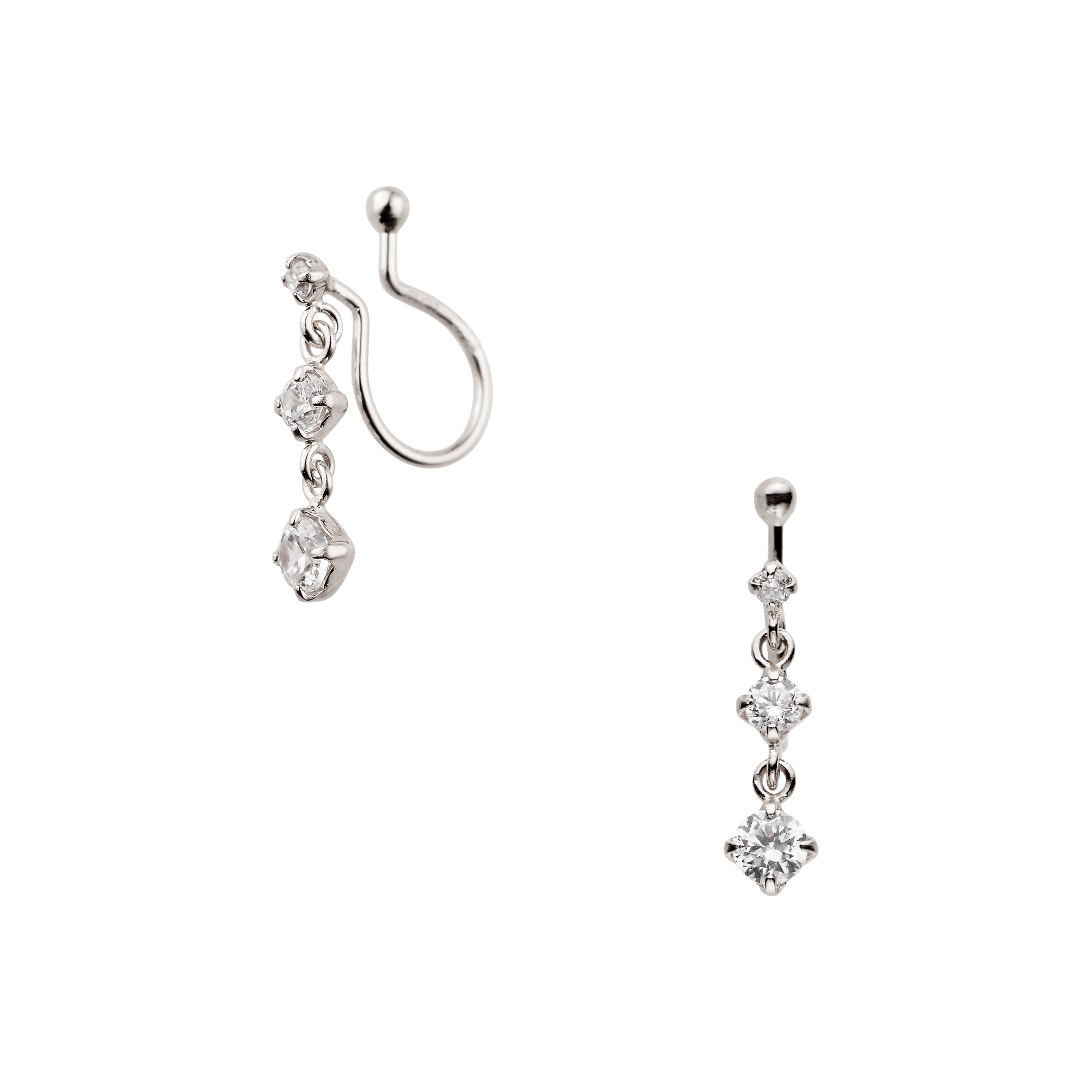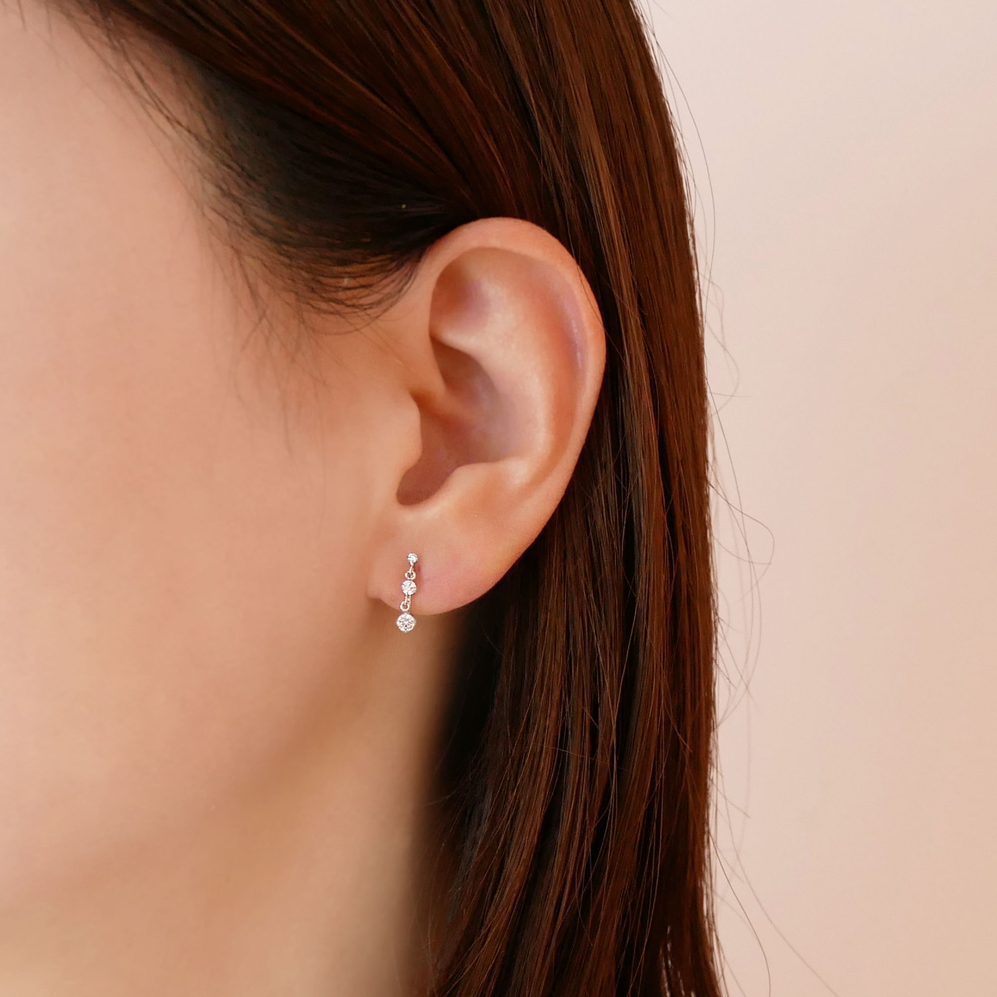 一番小さなストーンはダイヤモンドで、それに連なるキュービックジルコニアの縦のラインが顔周りをすっきりと見せてくれるデザイン。