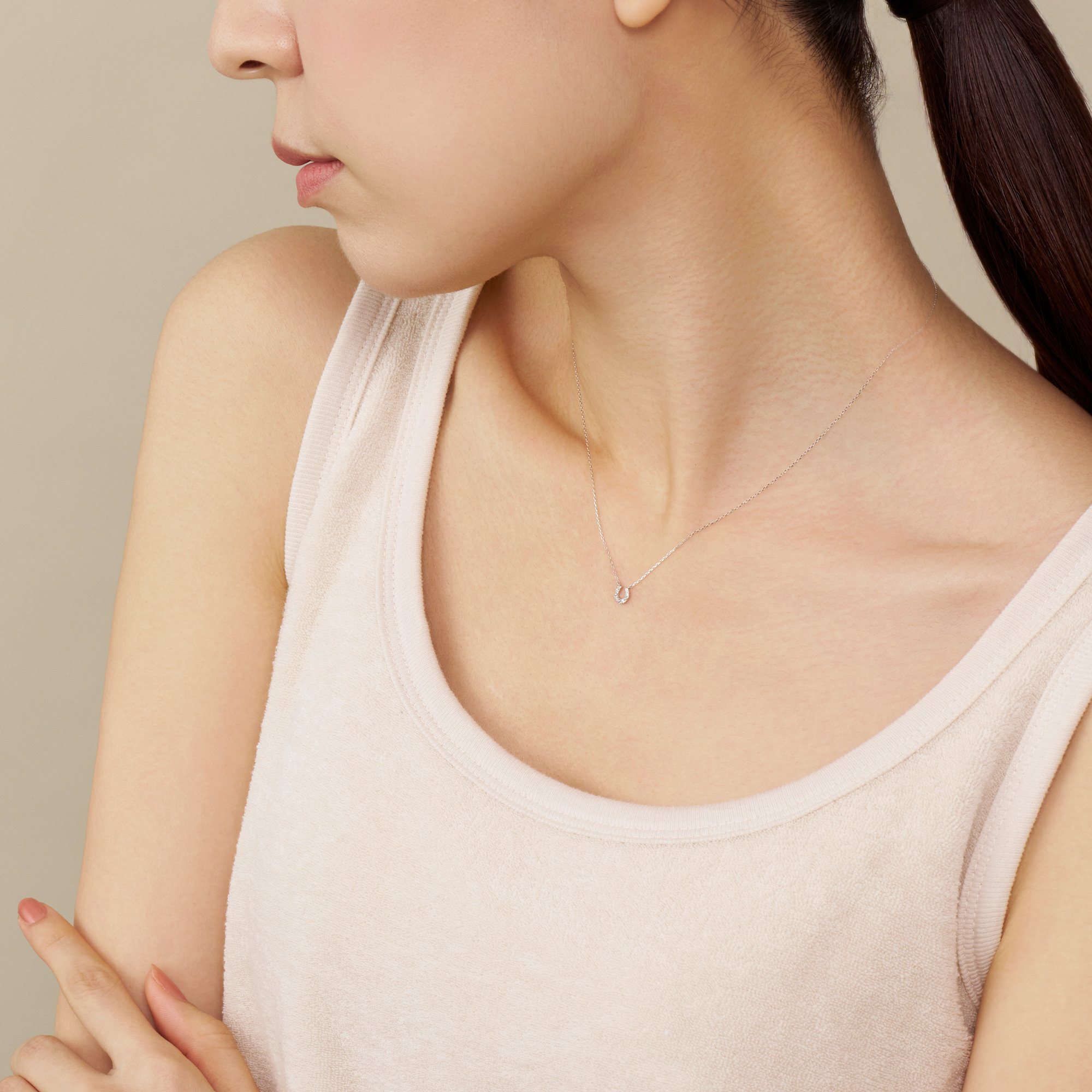 艶やかなホワイトゴールドの華奢なチェーンとダイヤモンドのきらめきが、胸元を上品に見せてくれます。