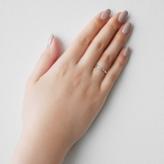 地金表面にカットが入ったリングは、甘さを抑えたスタイリッシュなデザインです。