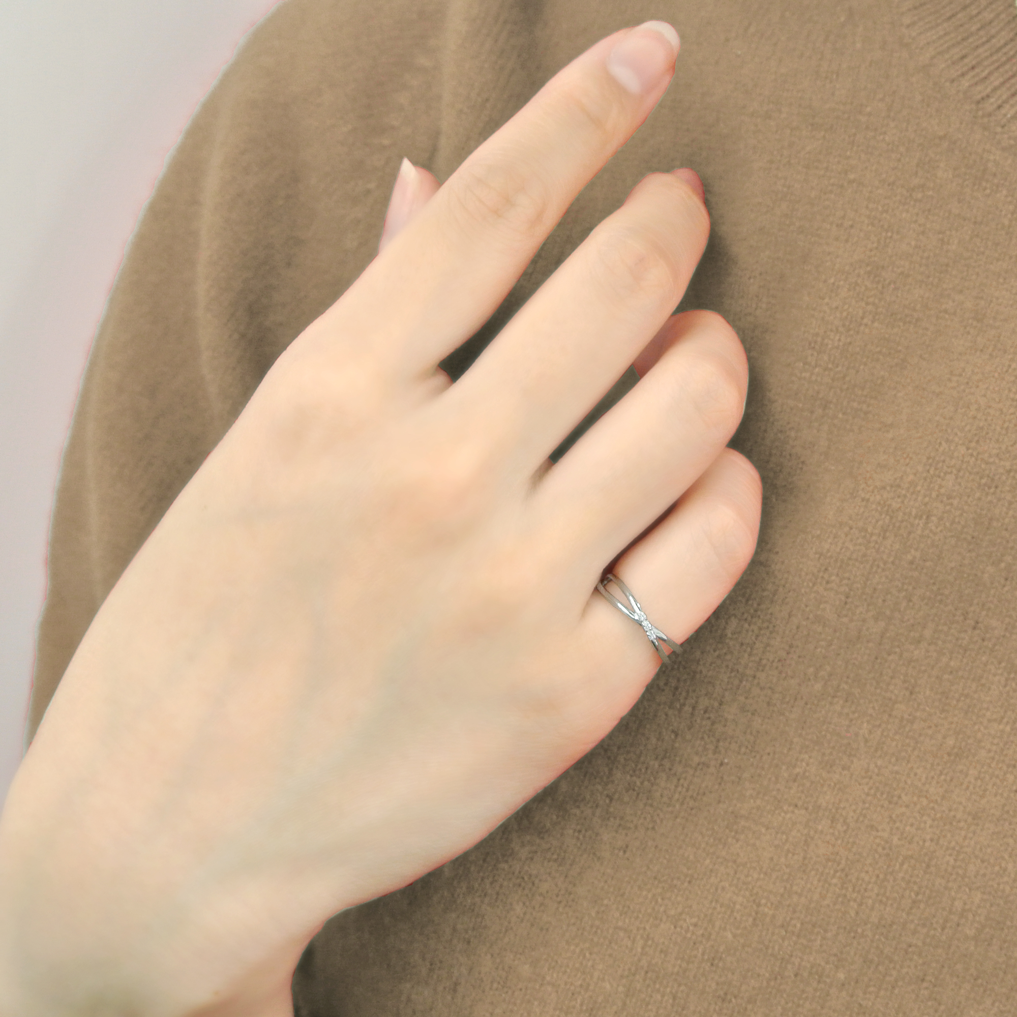 ホワイトゴールドがクロスするシンプルなデザインのピンキーリング。