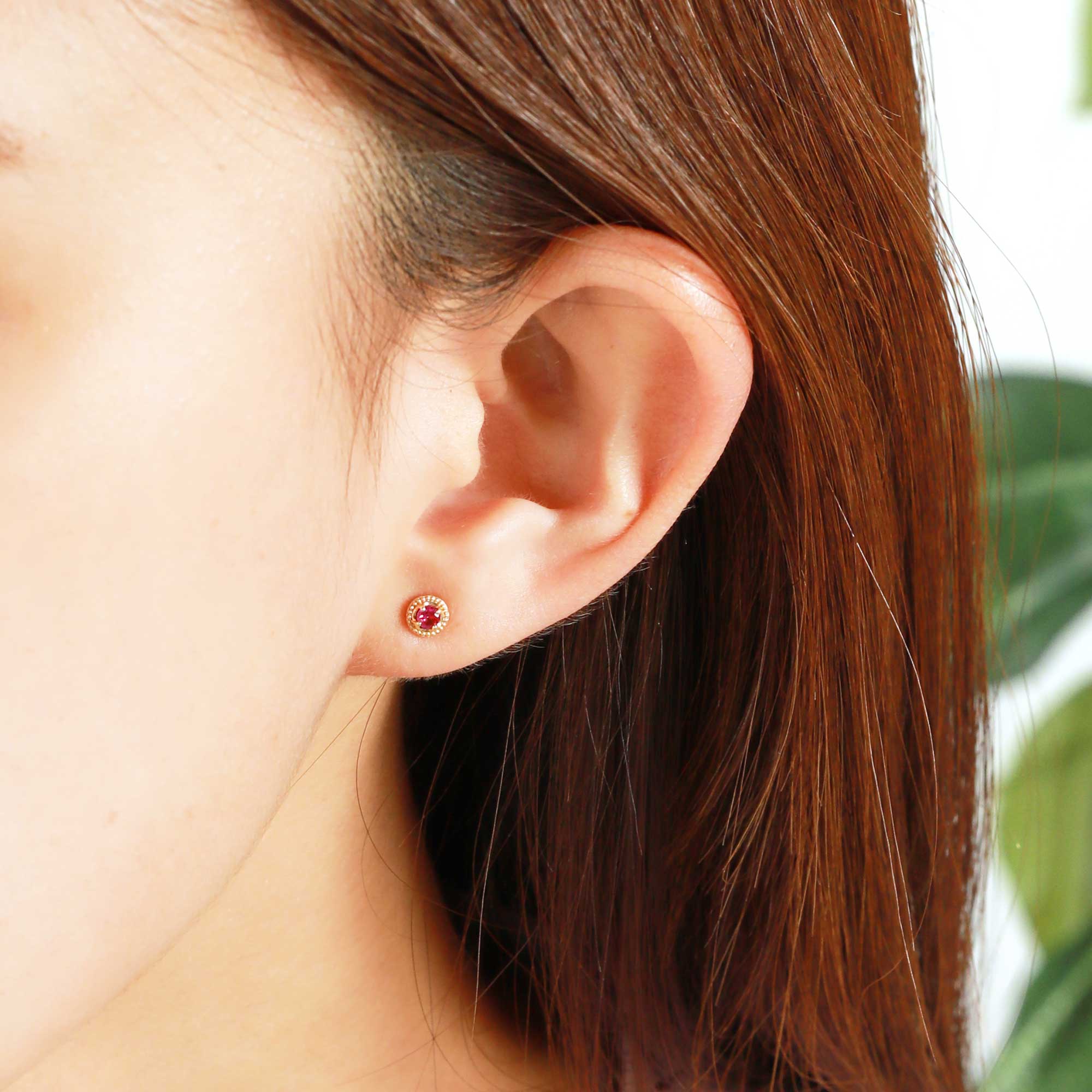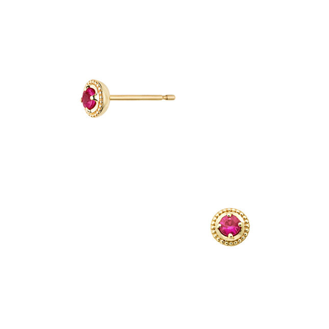鮮やかなルビーが横顔を華やかに印象付け、イエローゴールドのミルグレインが繊細でクラシカルな雰囲気をプラスします。