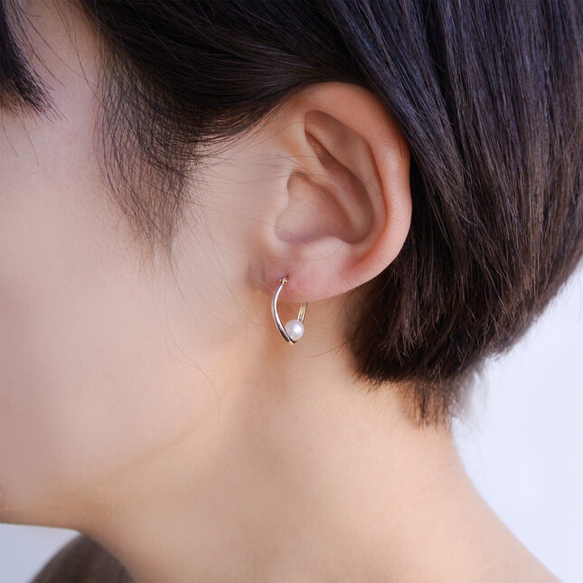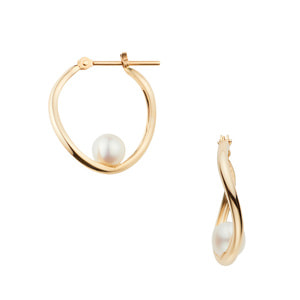 ひねりを加えたイエローゴールドのラインに、優しい色合いの淡水パールをあしらったフープタイプのピアス。