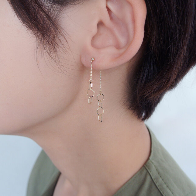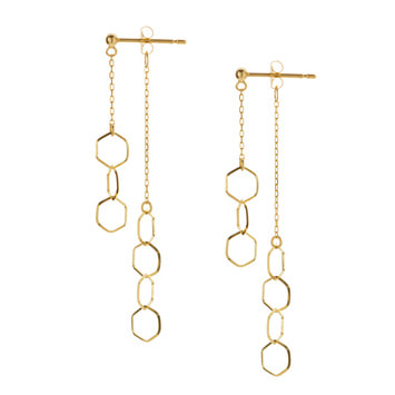 艶やかな地金が美しいイエローゴールドのラインで描かれた6角形のモチーフが揺れるロングピアス。