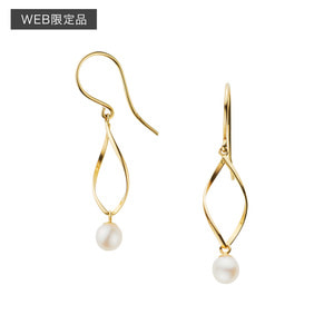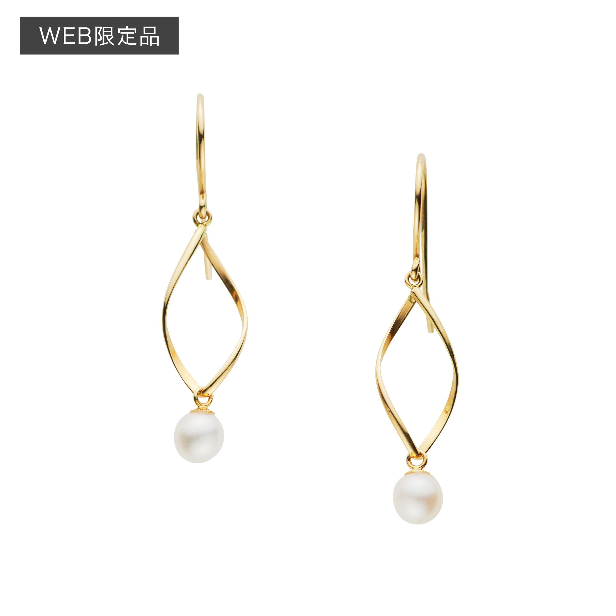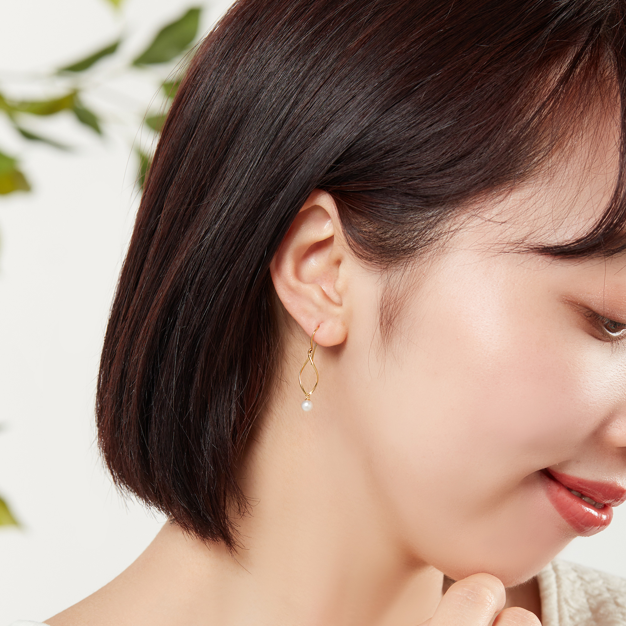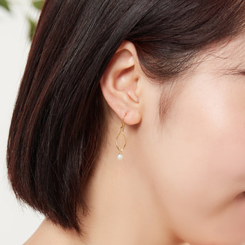 ひねりを加えたゴールドのリーフモチーフの下で、淡水パールが揺れる女性らしいピアス。