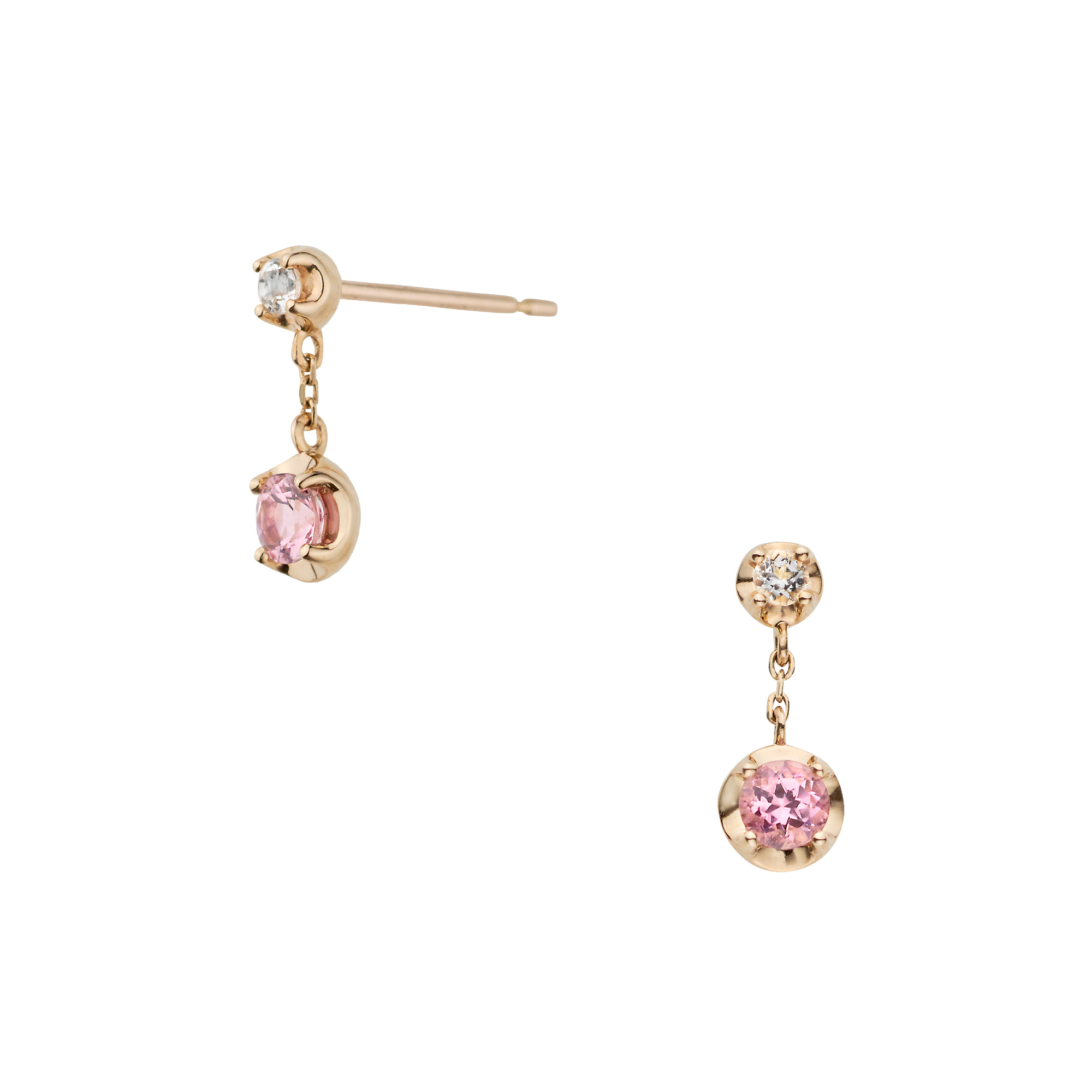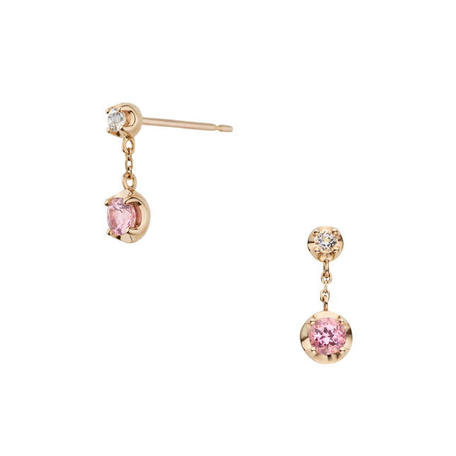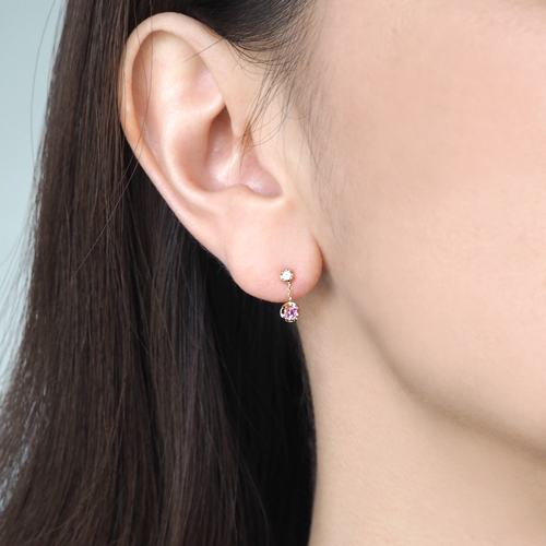 耳たぶからすぐ下に揺れる石枠には、存在感のある大きさのピンクトルマリン。