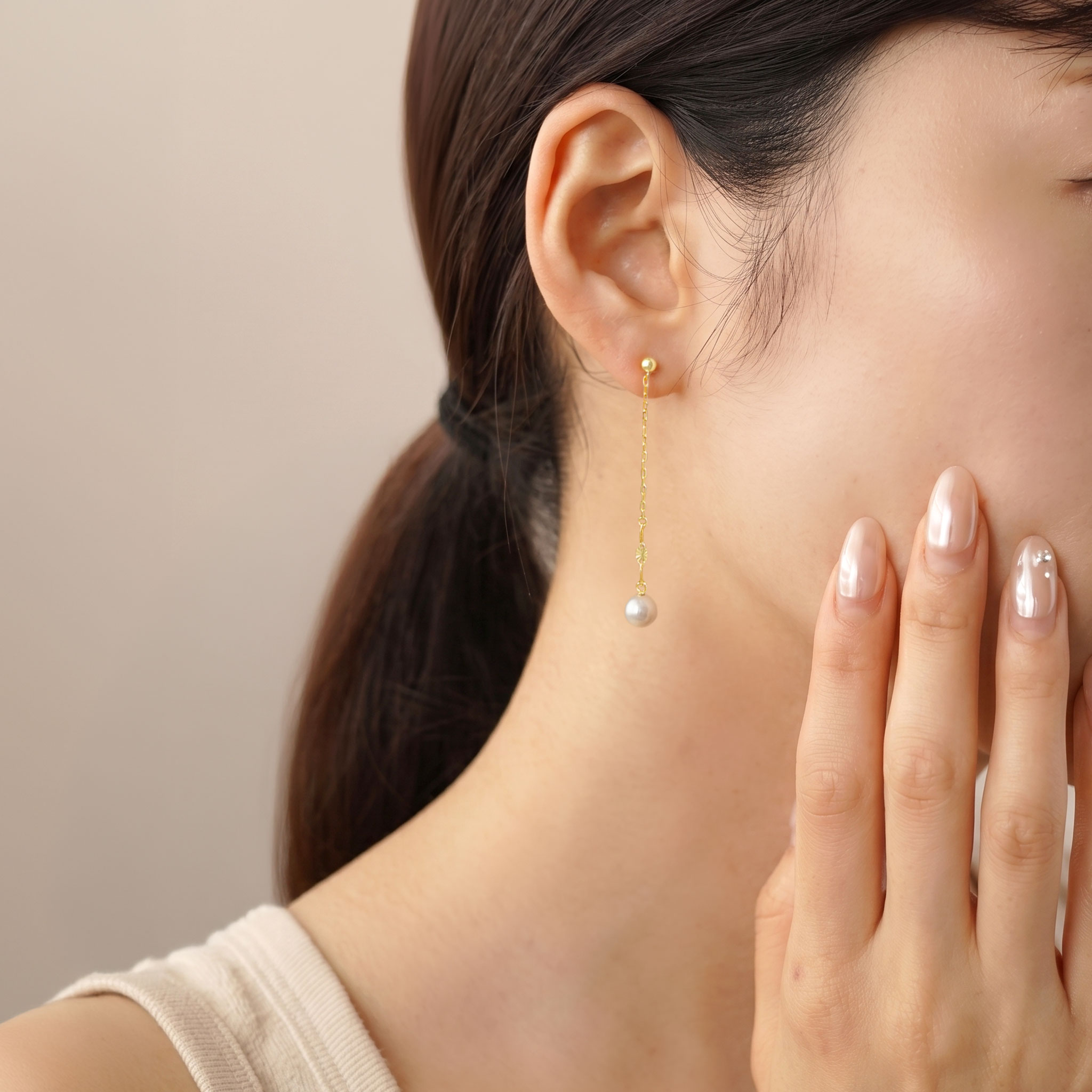 パールのやさしい輝きは表情を明るく見せる効果も。