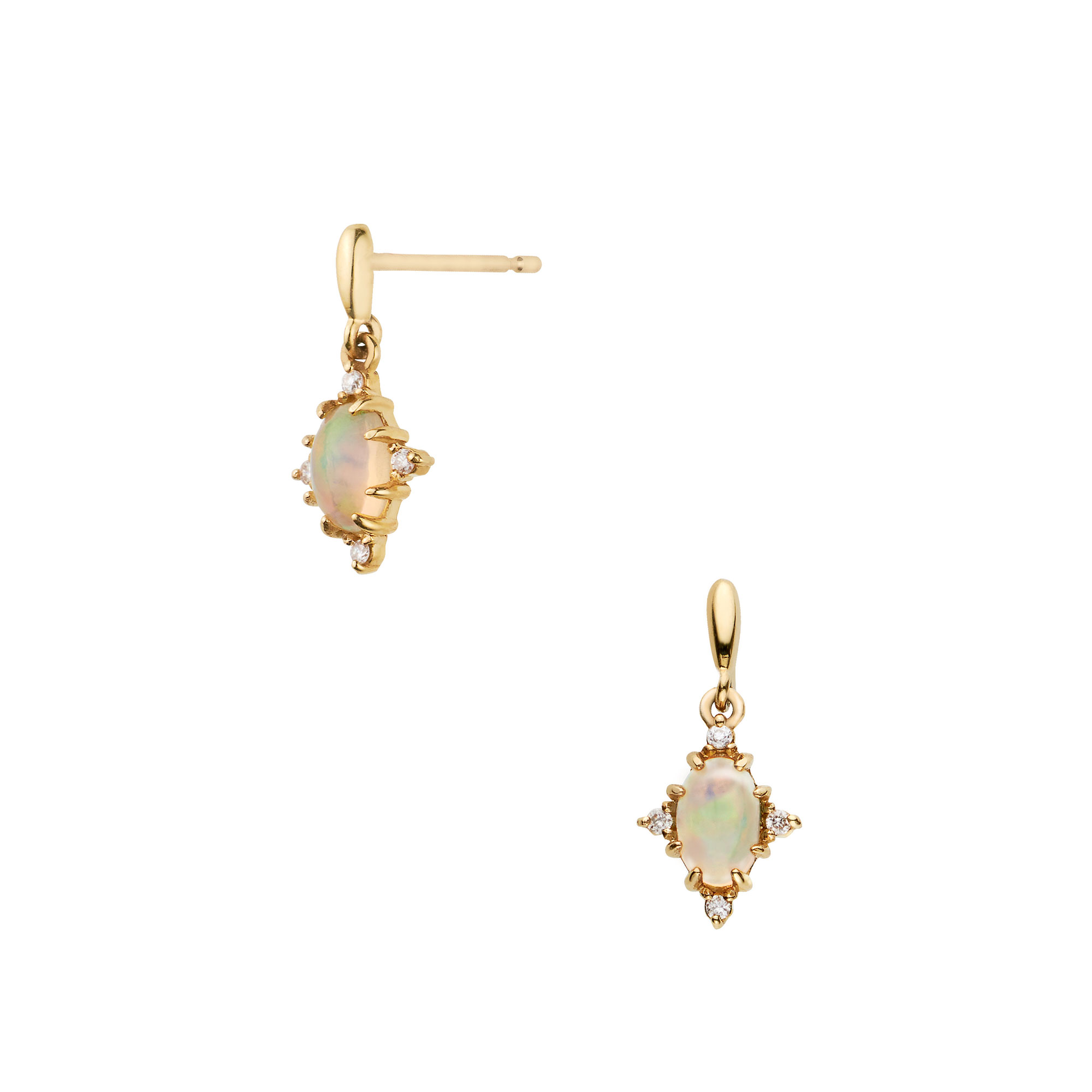 オーロラを閉じ込めたようなやわらかい表情のオパールにダイヤモンドが輝きを添え、異なる光が引き立て合い華やぎます。