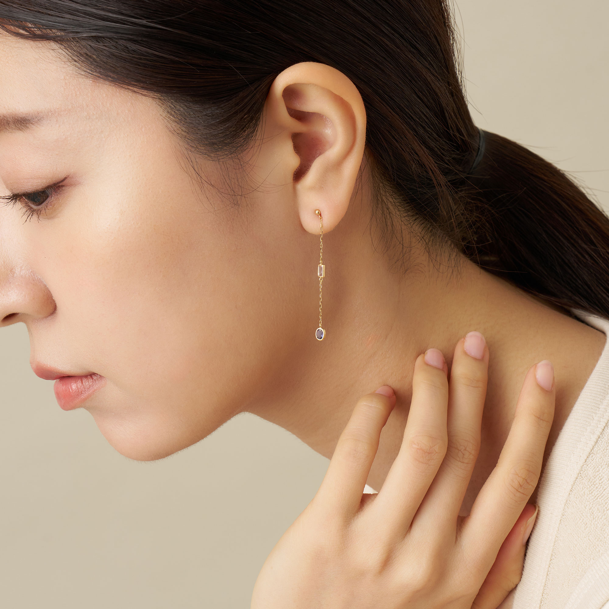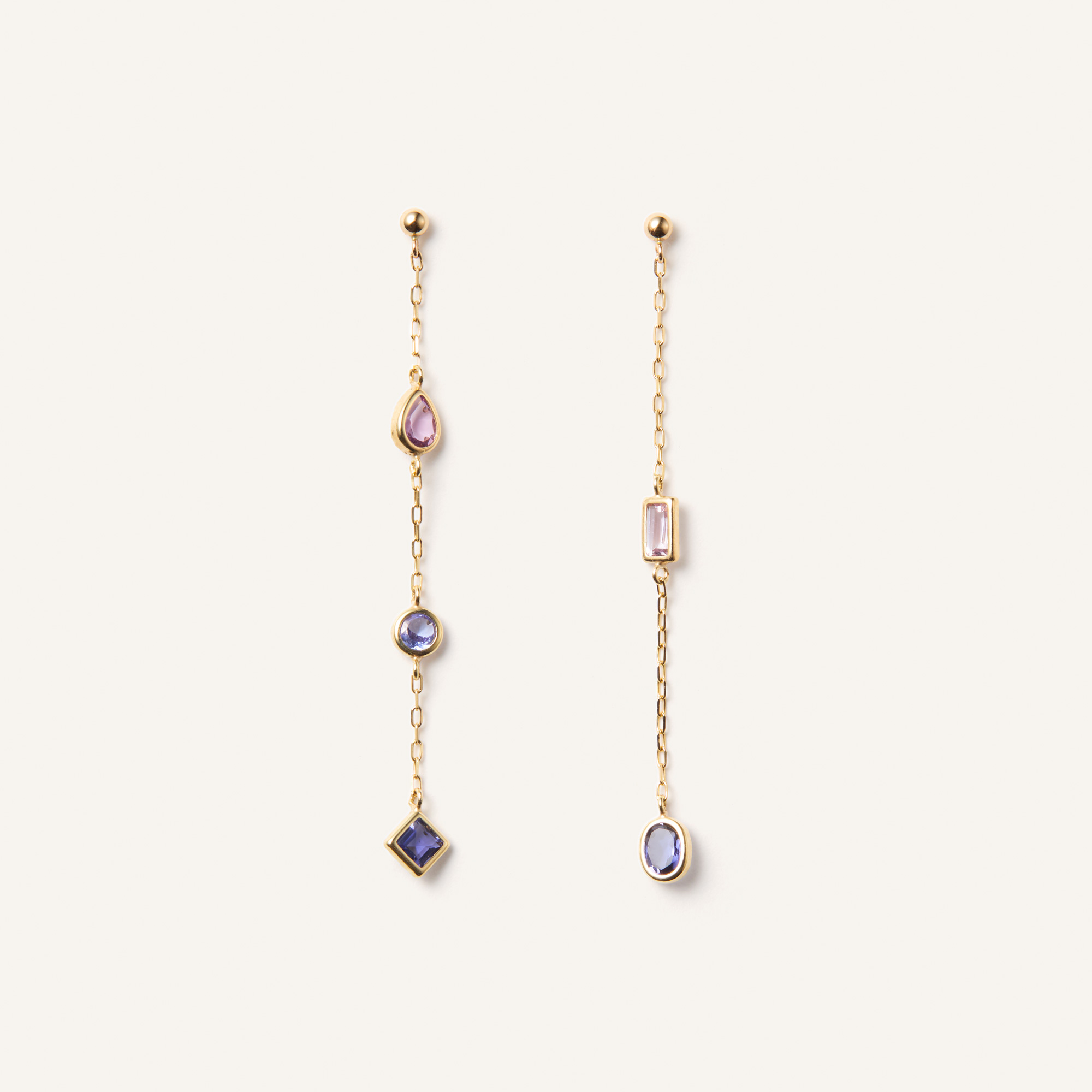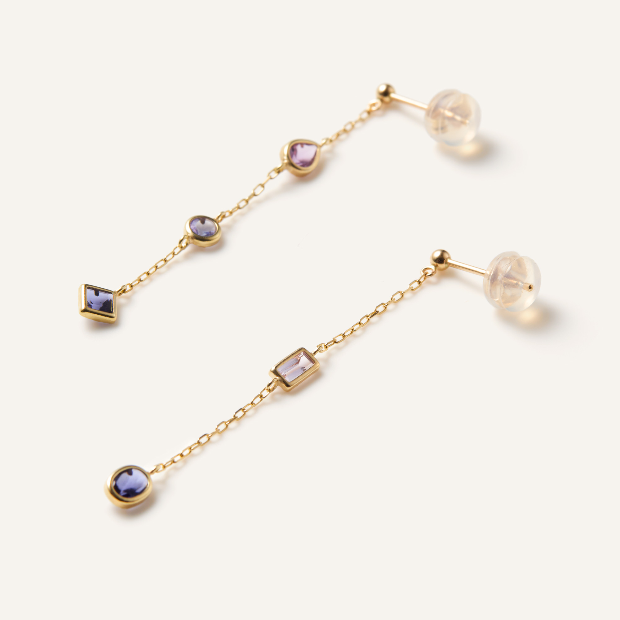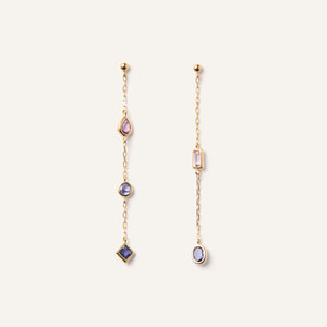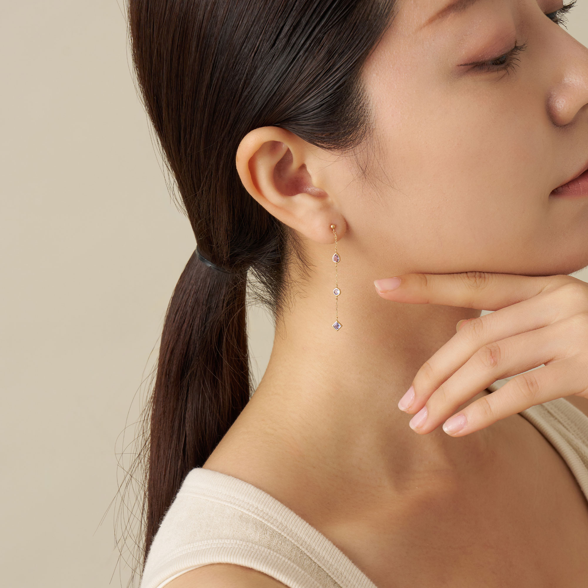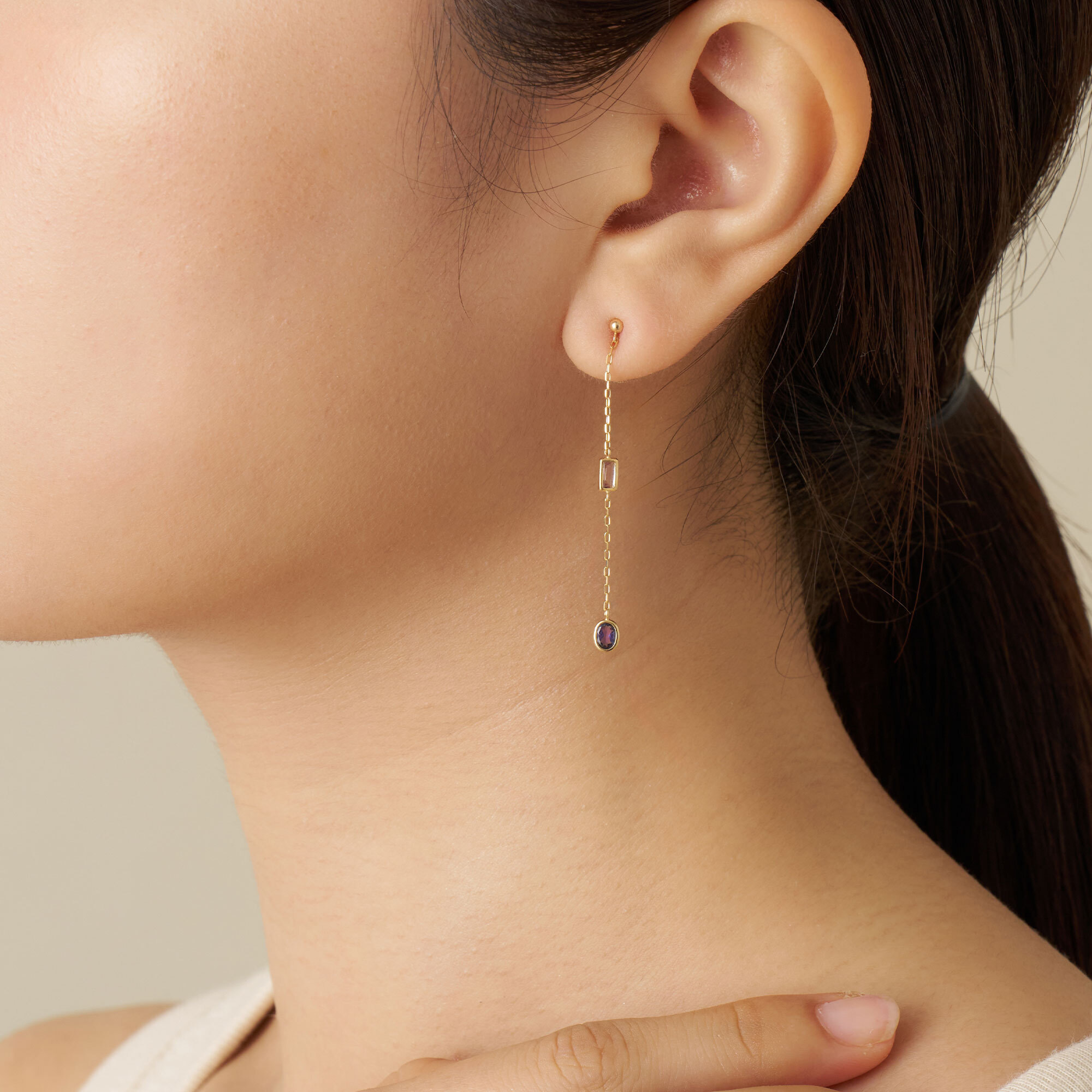 カラフルな宝石がまるでモザイクアートのようなジュエルモザイクシリーズ。 パープルカラーが上品な色合いのピアス。 カラーストーンは3種類をミックスし、カットも多様な組み合わせです。 透明感を感じられるカラーストーンは細いゴールドのラインで囲われた石座にセッティング。 地金でキリッと縁取ることで、それぞれの石の輪郭を際立たせています。 少しシャープな印象もプラスされ、甘くなりすぎない仕上がりに。 落ち着いたパープルカラーは、シックで大人っぽい雰囲気に見せてくれます。▼カラーバリエーションはこちら▼ジュエルモザイクシリーズはこちら▼2月の誕生石アメシストのアイテムはこちら▼3月の誕生石アイオライトのアイテムはこちら▼12月の誕生石タンザナイトのアイテムはこちら