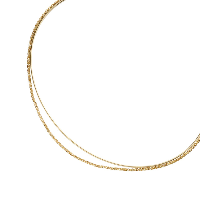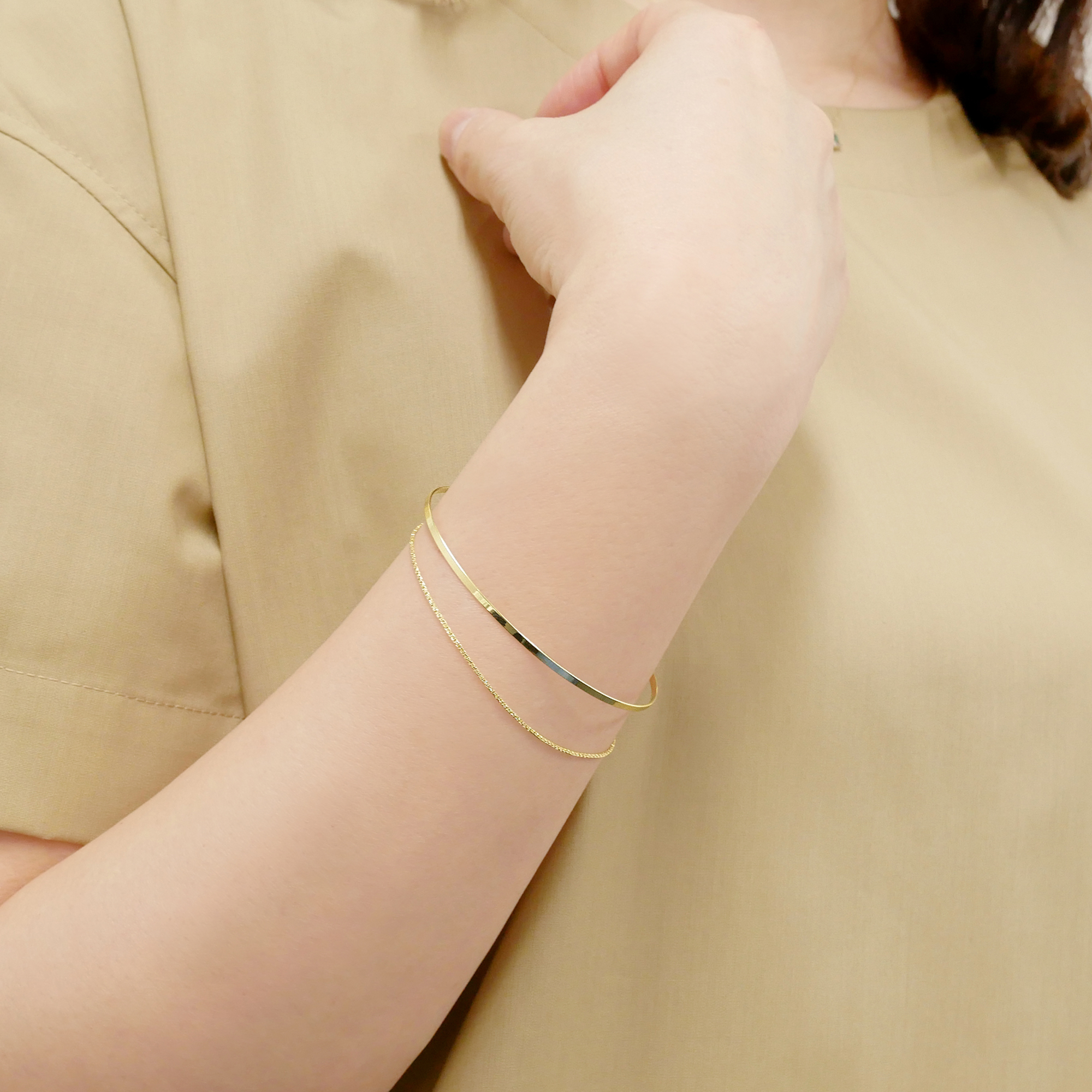 細いゴールドの地金ときらめくチェーンの組み合わせが、手首を女性らしく華奢に見せてくれます。