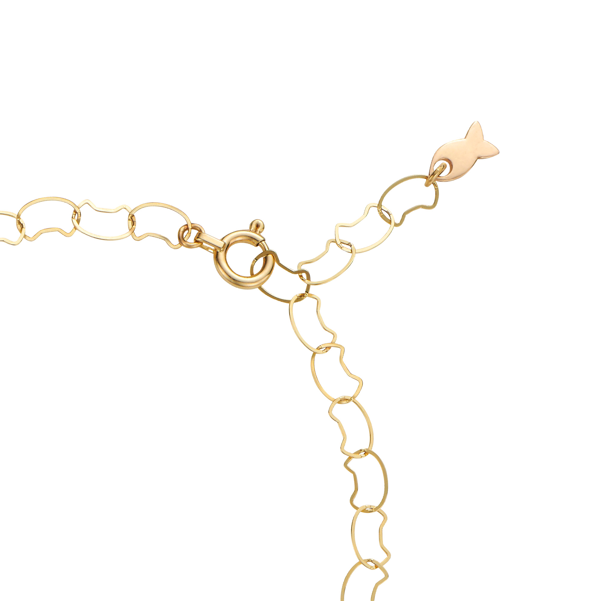 動きに合わせて魚とねこのチェーンが揺れ、繊細なゴールドの光が煌めきます。