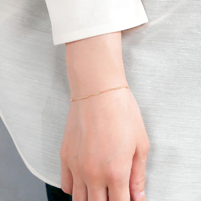 キラキラ輝くテクスチャーの入ったチェーンを使ったブレスレット。