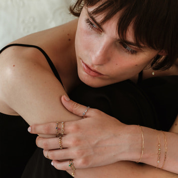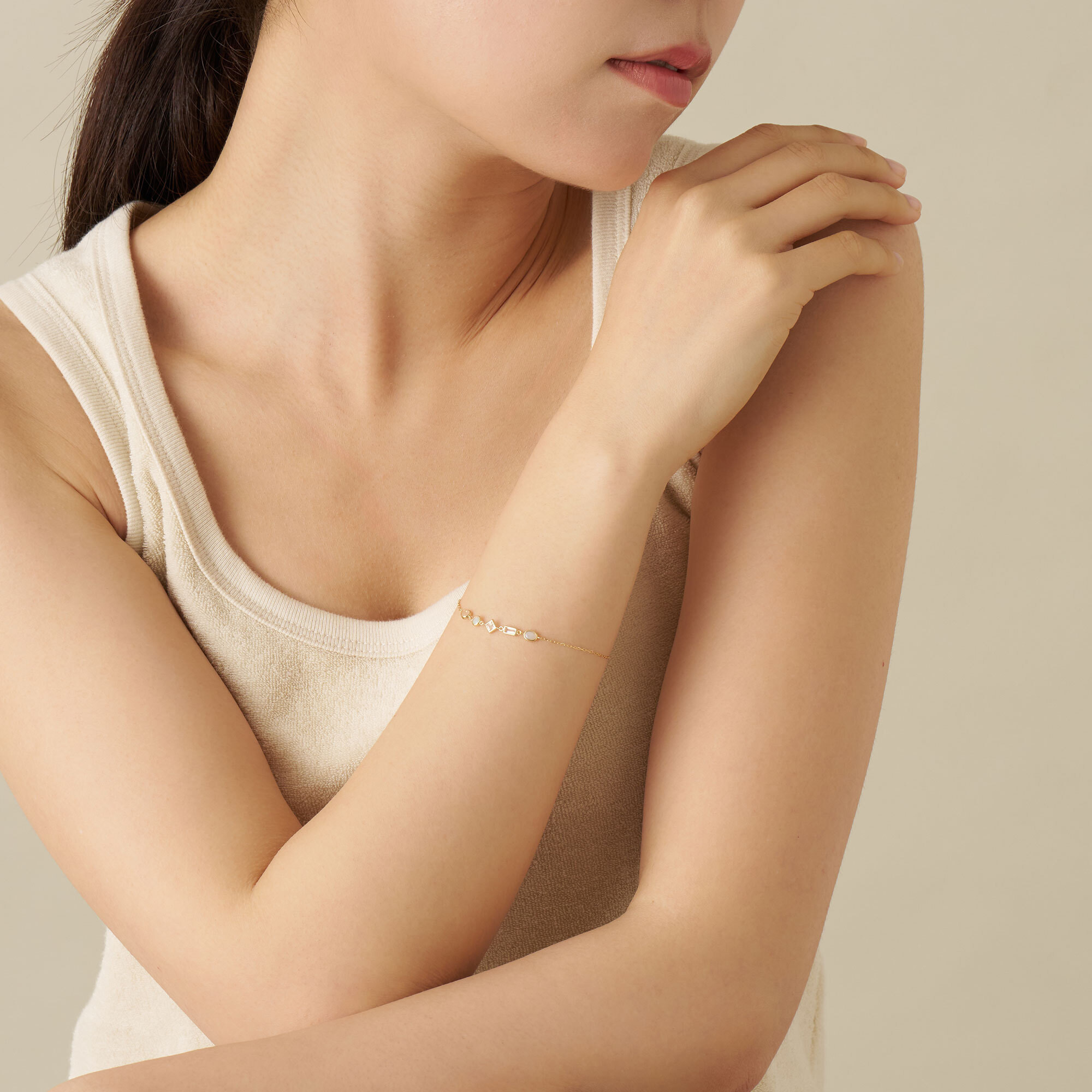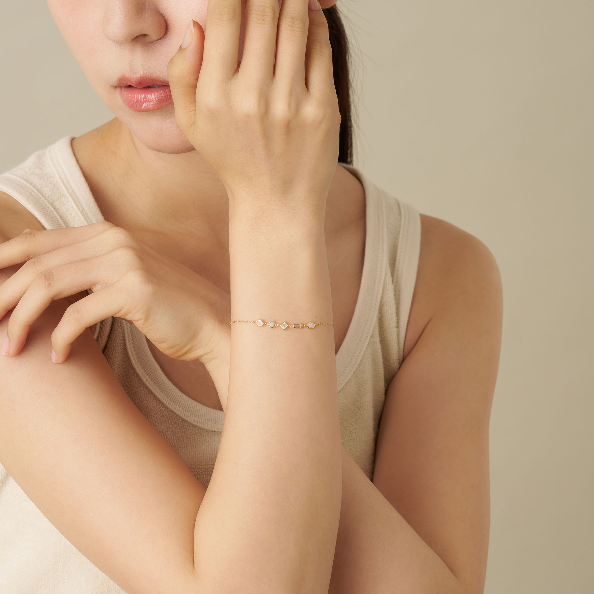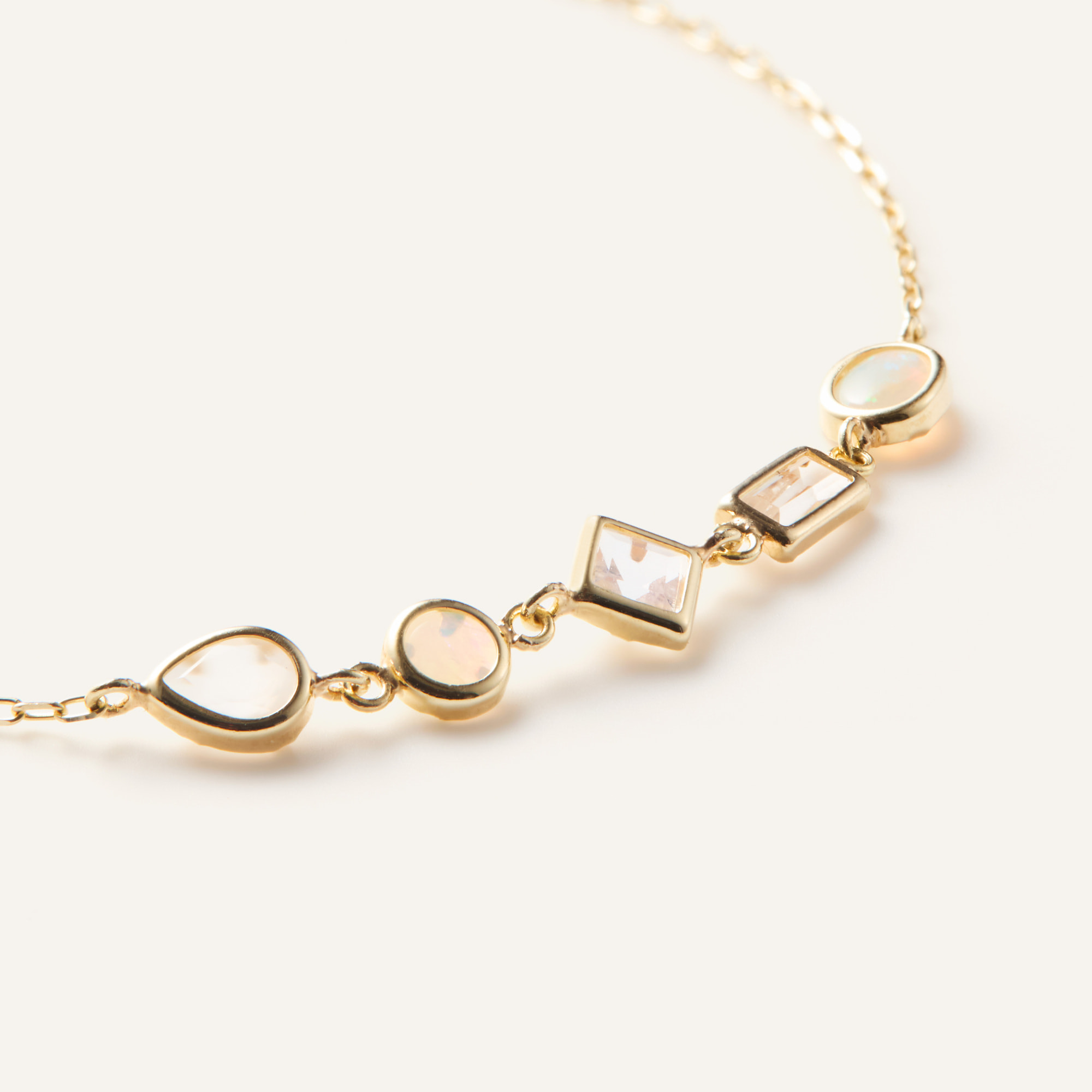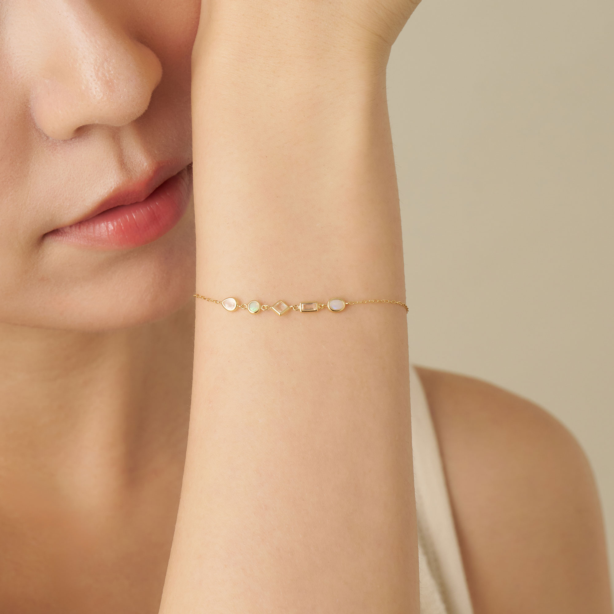 カラフルな宝石がまるでモザイクアートのようなジュエルモザイクシリーズ。 ホワイトカラーのブレスレット。 カラーストーンは4種類をミックスし、カットも多様な組み合わせ。 人気のオパールやムーンストーンなどさまざまな白色のカラーストーンをセレクトし、単色ではない色合わせで柔らかい雰囲気です。 石は細いゴールドのラインで囲われた石座にセッティング。 地金でキリッと縁取ることで、それぞれの石の輪郭を際立たせています。 少しシャープな印象もプラスされ、甘くなりすぎない仕上がりに。 クリーンな色合いのホワイトカラーが清楚な印象を手元に添えます。▼カラーバリエーションはこちら▼ジュエルモザイクシリーズはこちら▼10月の誕生石オパールのアイテムはこちら▼11月の誕生石トパーズのアイテムはこちら