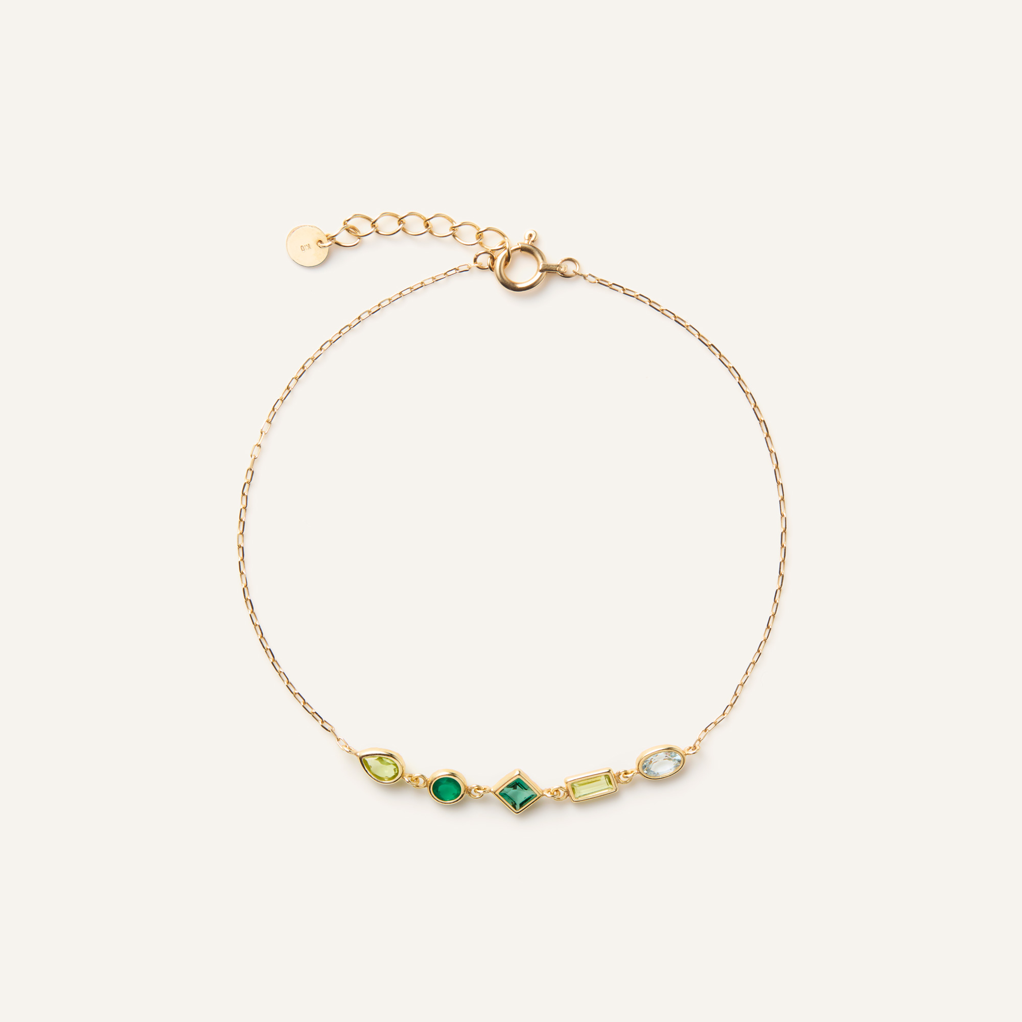 カラフルな宝石がまるでモザイクアートのようなジュエルモザイクシリーズ。 グリーンカラーを基調としたブレスレット。 カラーストーンは4種類をミックスし、カットも多様な組み合わせです。 細いゴールドで縁取られた石は、うるうるとした透明感を感じられます。 新芽のような瑞々しいグリーンカラーは、爽やかな印象を手元に添えます。▼カラーバリエーションはこちら▼ジュエルモザイクシリーズはこちら▼ブルートパーズのアイテムはこちら▼8月の誕生石 ペリドットのアイテムはこちら