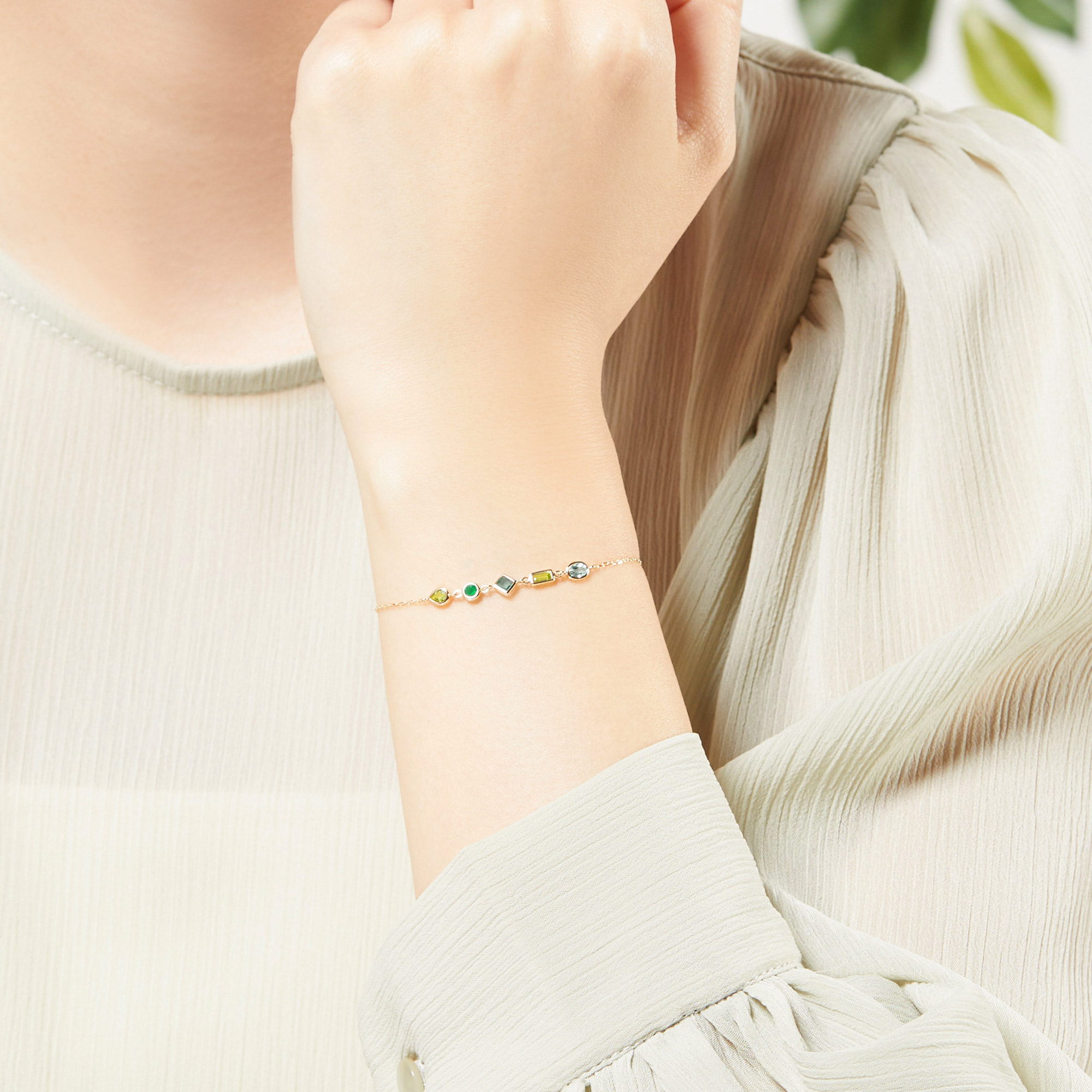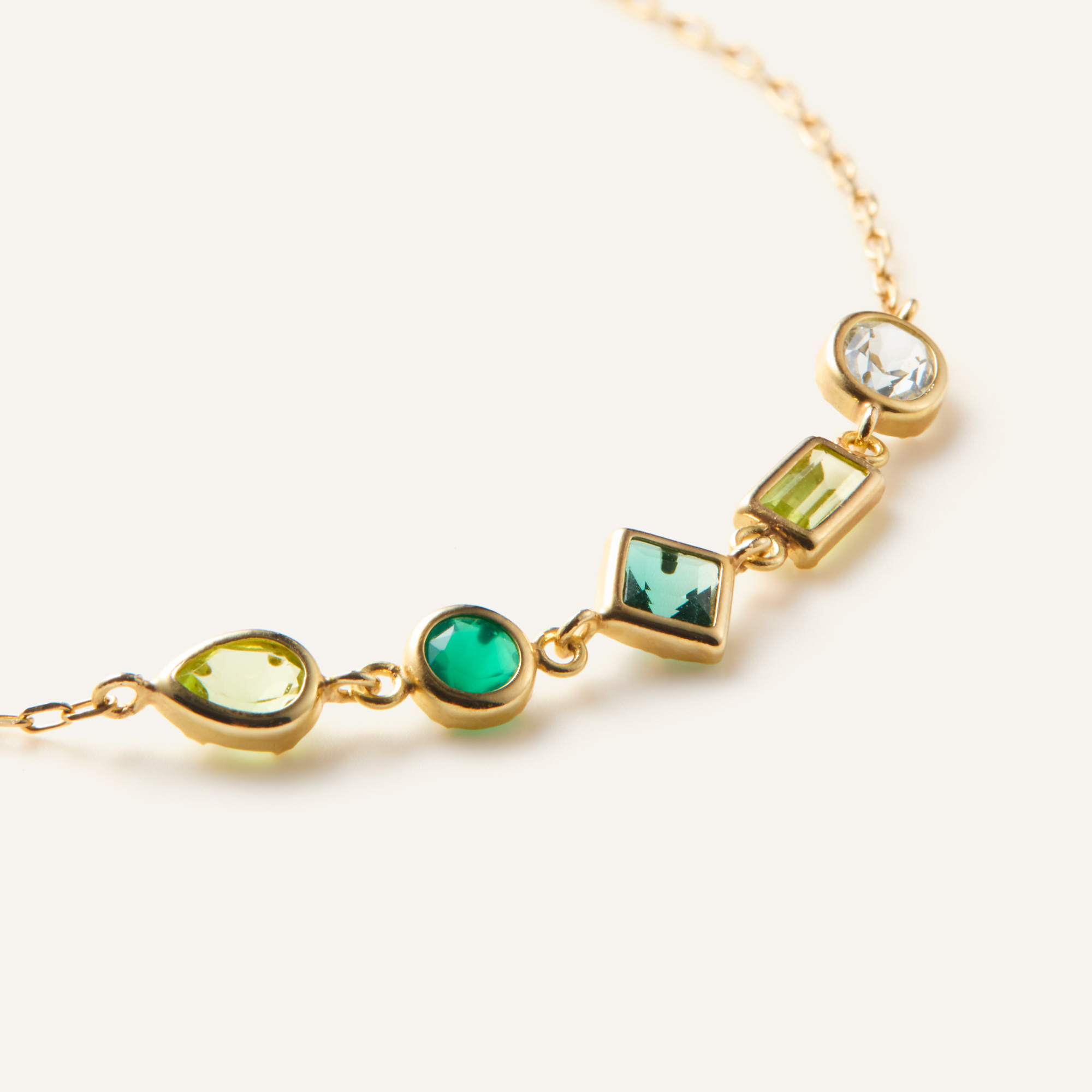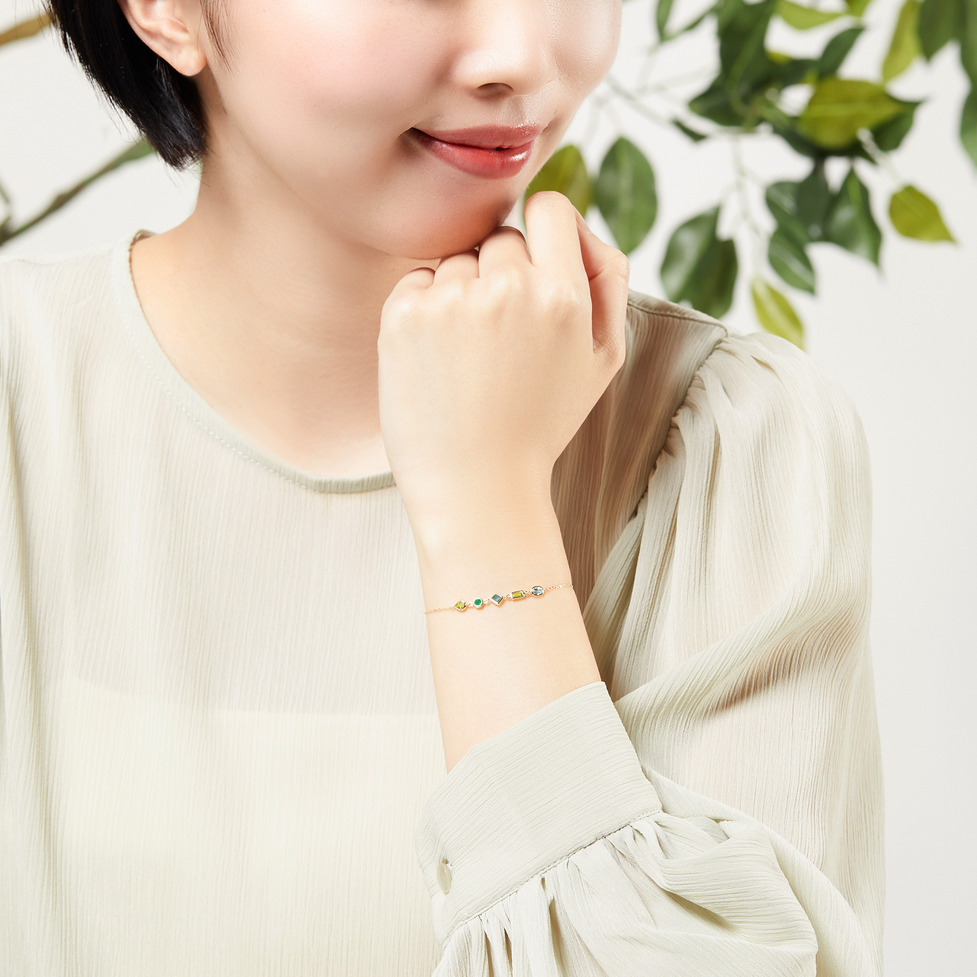 カラフルな宝石がまるでモザイクアートのようなジュエルモザイクシリーズ。 グリーンカラーを基調としたブレスレット。 カラーストーンは4種類をミックスし、カットも多様な組み合わせです。 細いゴールドで縁取られた石は、うるうるとした透明感を感じられます。 新芽のような瑞々しいグリーンカラーは、爽やかな印象を手元に添えます。▼カラーバリエーションはこちら▼ジュエルモザイクシリーズはこちら▼ブルートパーズのアイテムはこちら▼8月の誕生石 ペリドットのアイテムはこちら