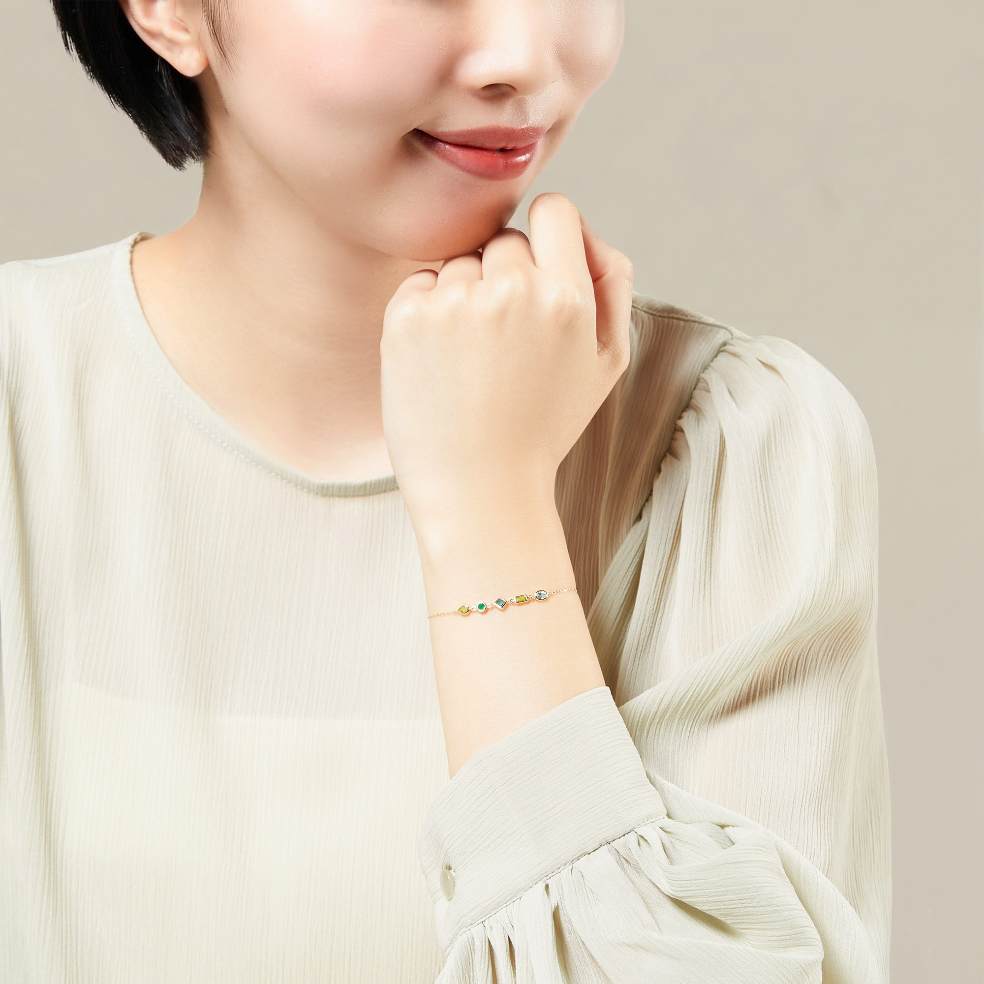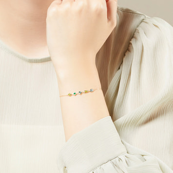 カラフルな宝石がまるでモザイクアートのようなジュエルモザイクシリーズ。 グリーンカラーを基調としたブレスレット。 カラーストーンは4種類をミックスし、カットも多様な組み合わせです。 細いゴールドで縁取られた石は、うるうるとした透明感を感じられます。 新芽のような瑞々しいグリーンカラーは、爽やかな印象を手元に添えます。▼カラーバリエーションはこちら▼ジュエルモザイクシリーズはこちら▼ブルートパーズのアイテムはこちら▼8月の誕生石 ペリドットのアイテムはこちら