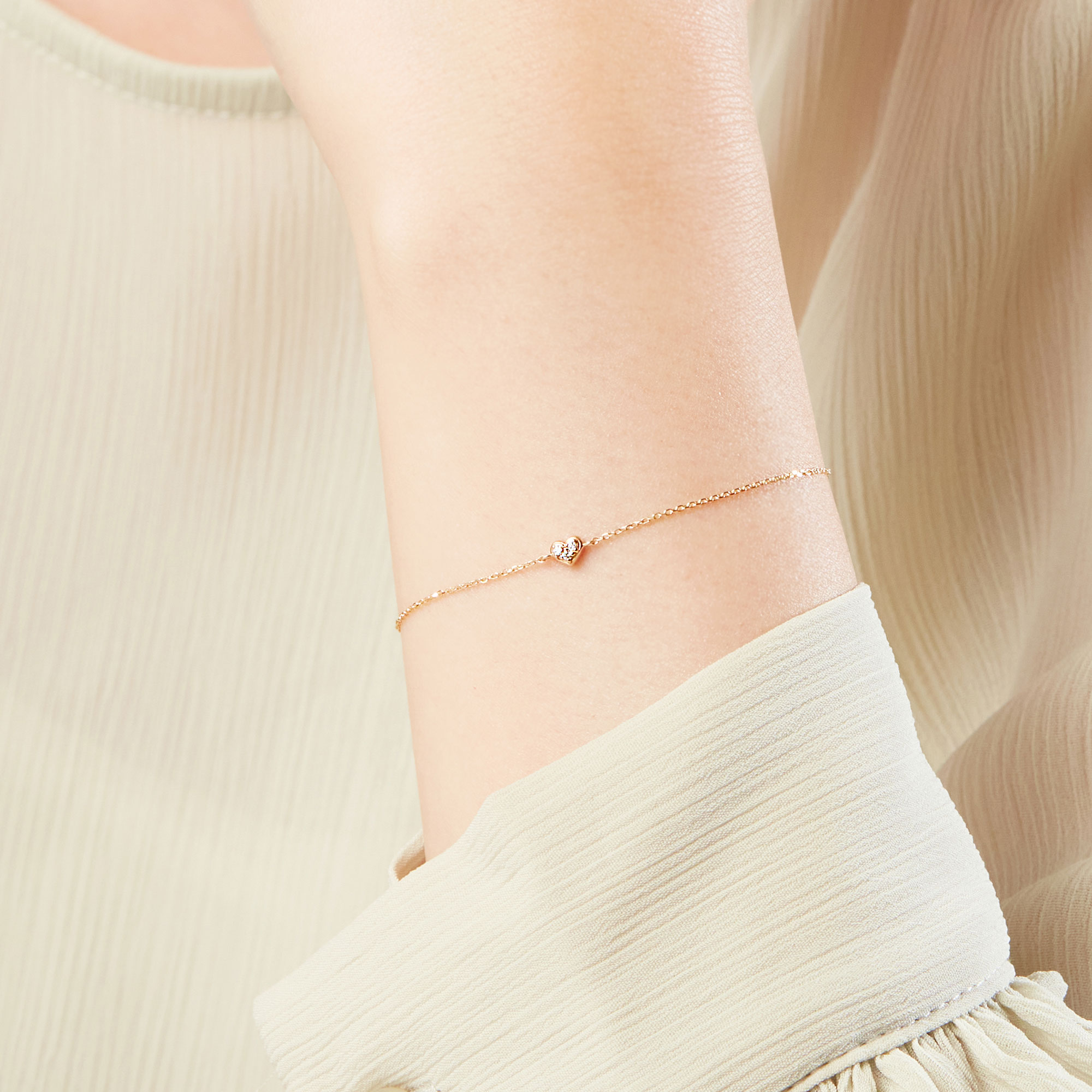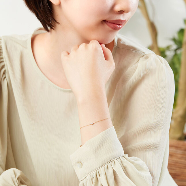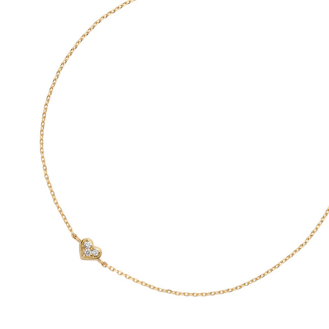 ころんとした小さなハートモチーフにダイヤモンドが3石輝く可愛らしいブレスレット。