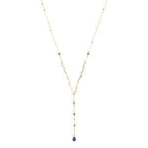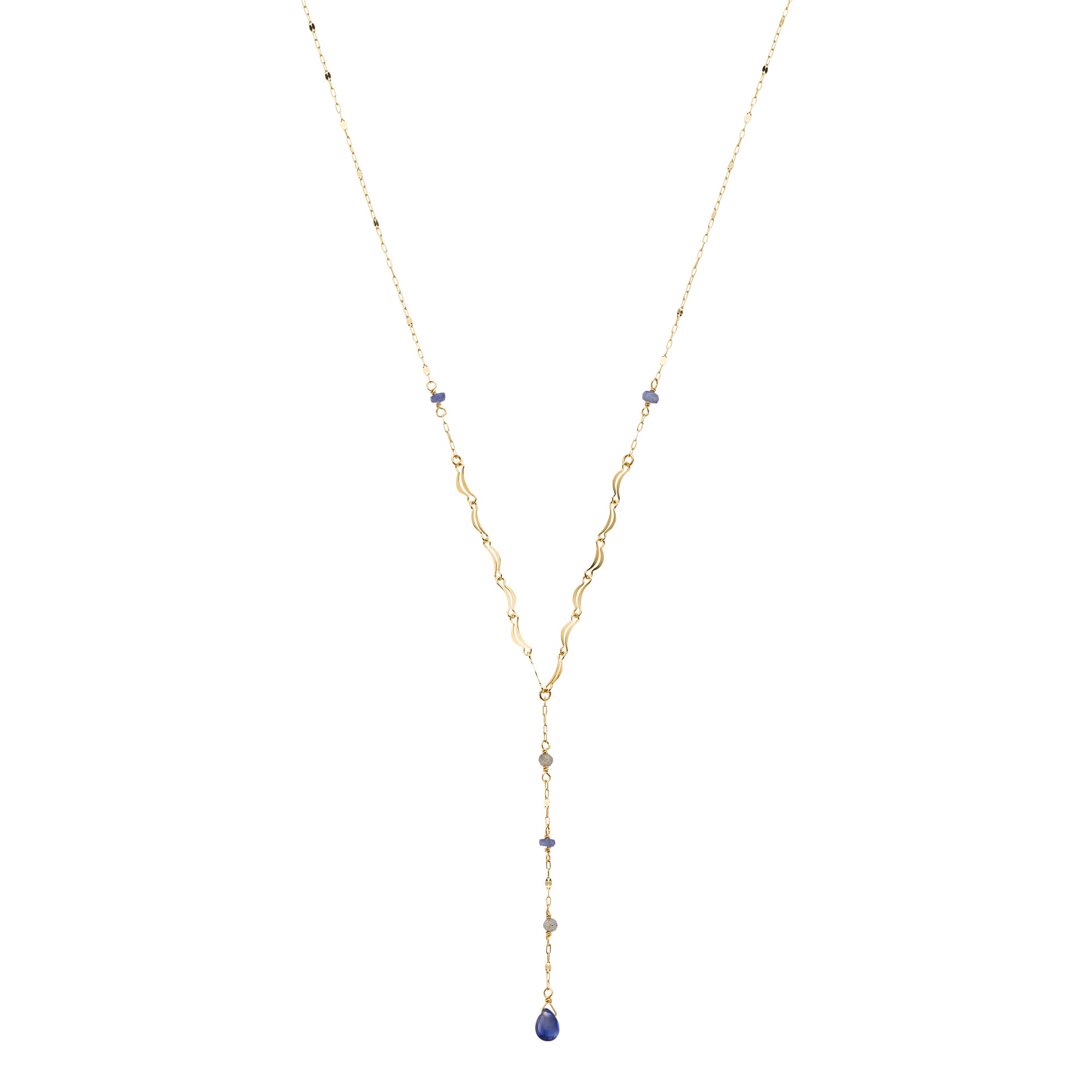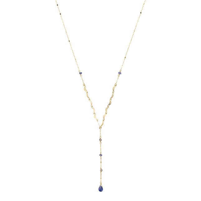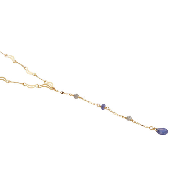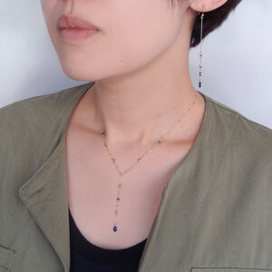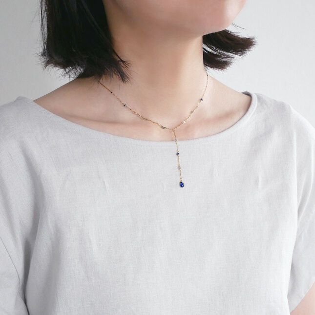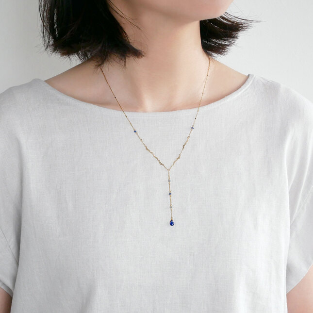 身に着ける人の動きに合わせてきらめくデザインチェーンに、カイヤナイトの艶やかなしずくがきらめくロングネックレス。