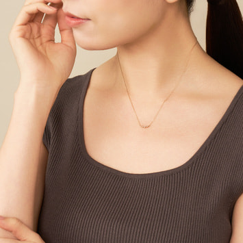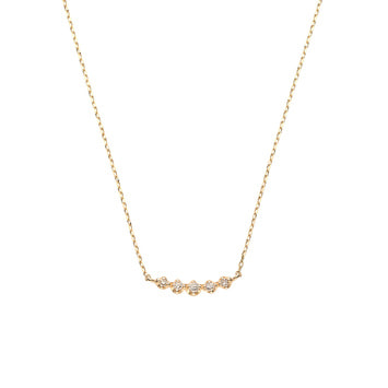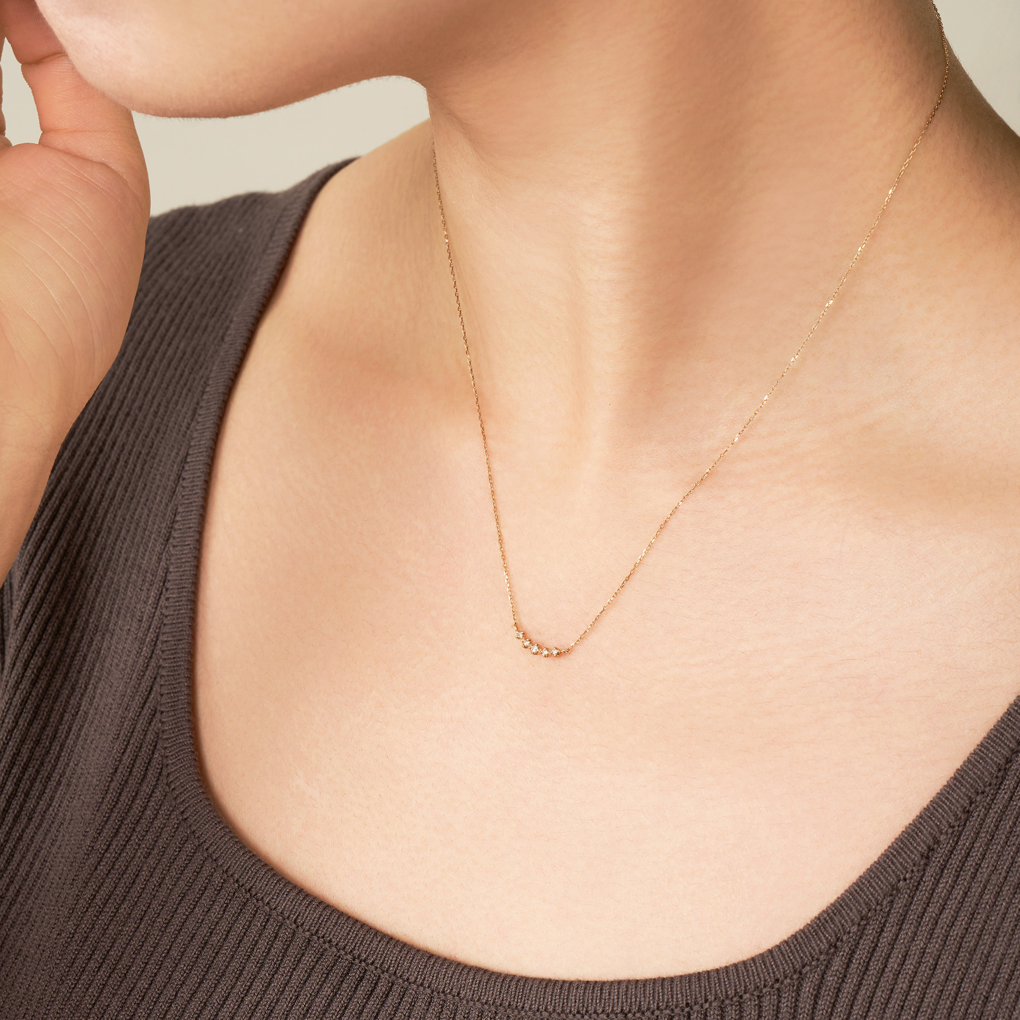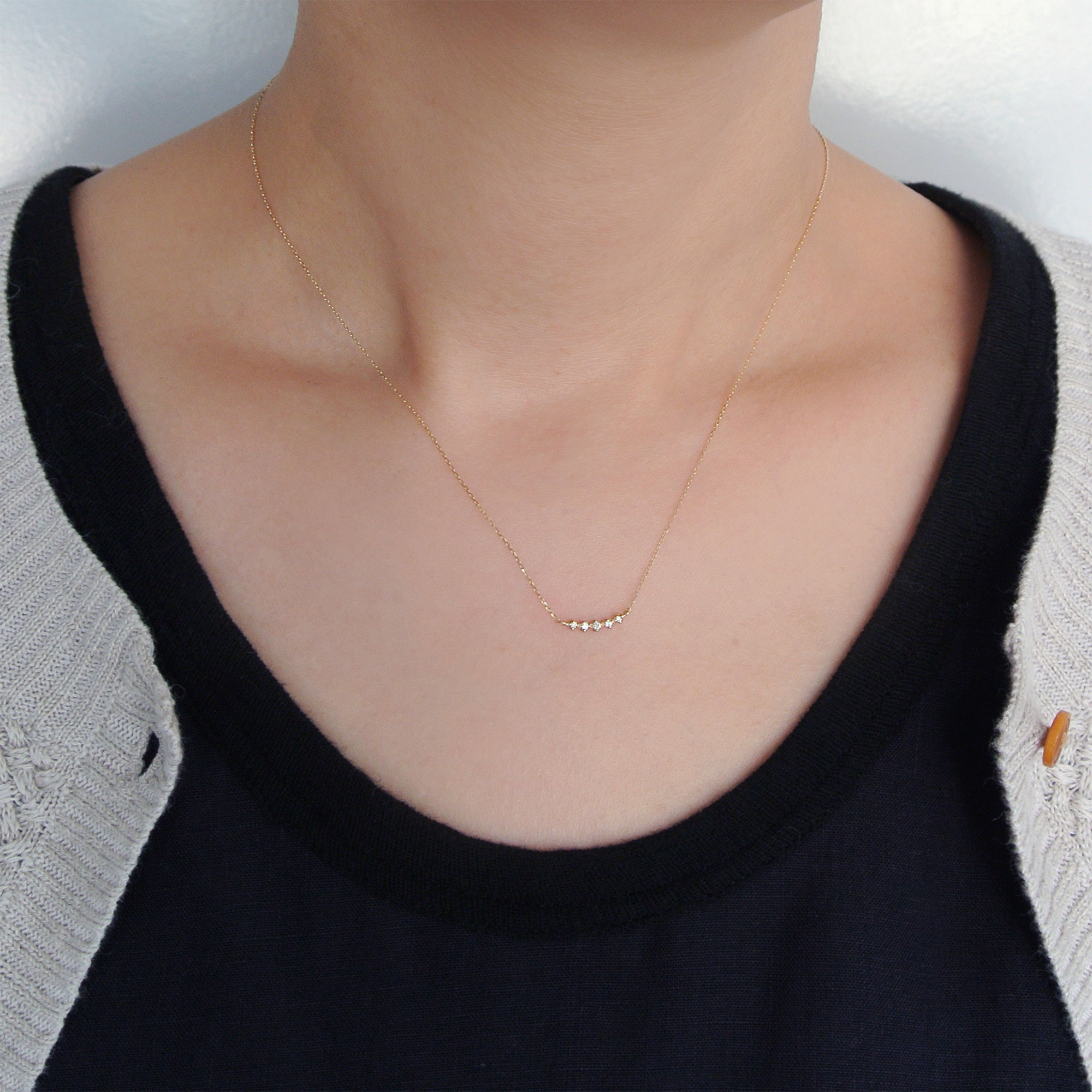 一粒ずつが横並びになることで、それぞれのダイヤモンドの輝きが増して見えるのが魅力的。艶やかなイエローゴールドが胸元に華やぎをプラス。中央からサイズグラデーションになっていて、しなやかなラインが女性らしさを引き立てるデザインです。