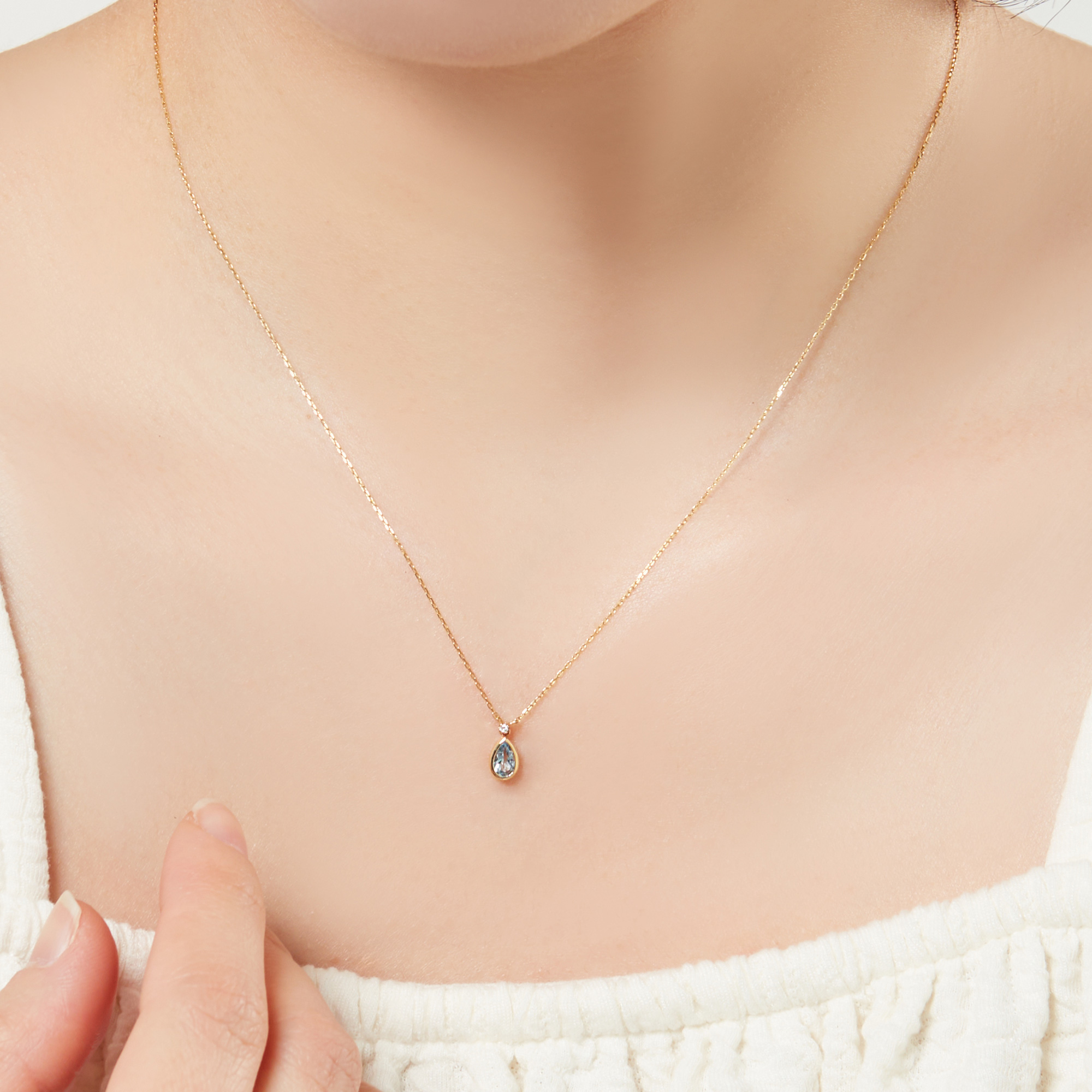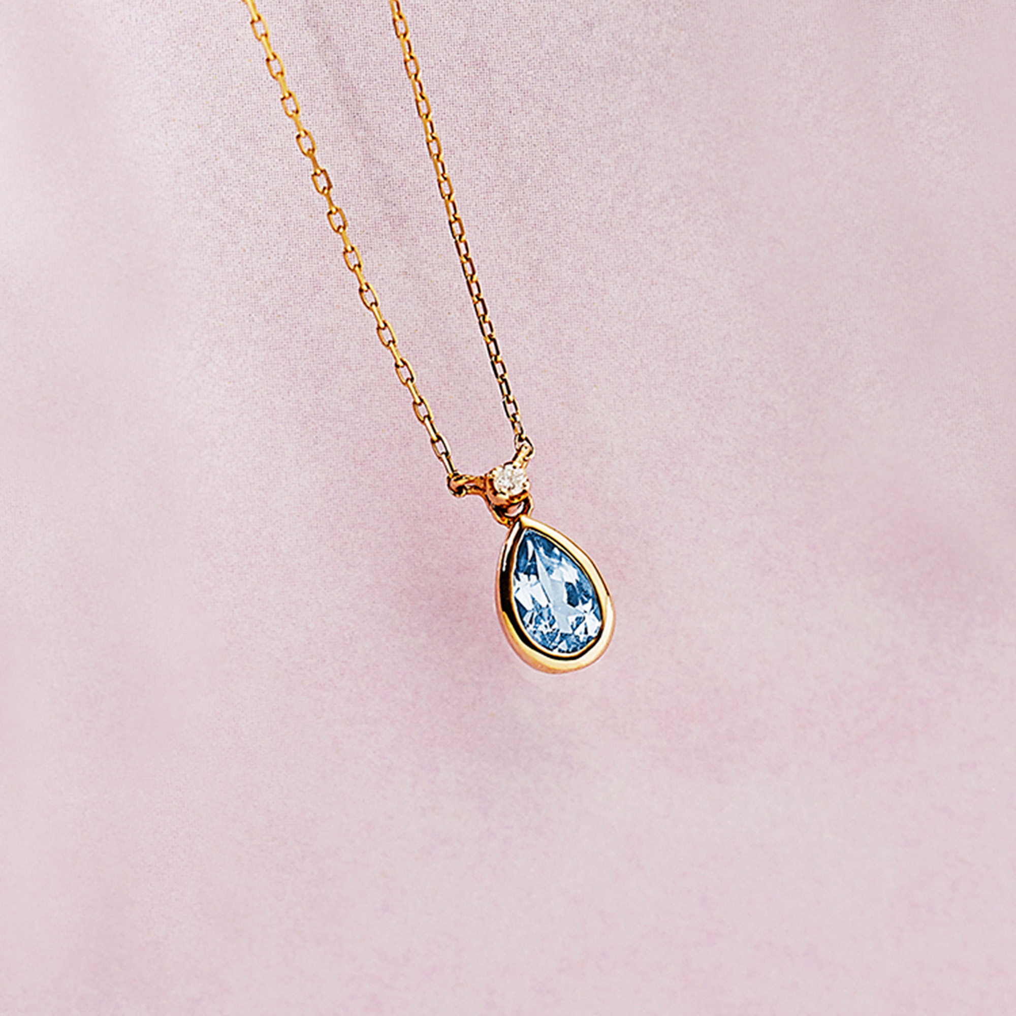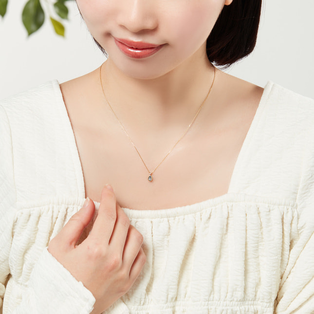 アクアマリンの石座は揺れる作りとなっているので、動きに合わせてきらきらと輝き胸元に女性らしさをプラスします。