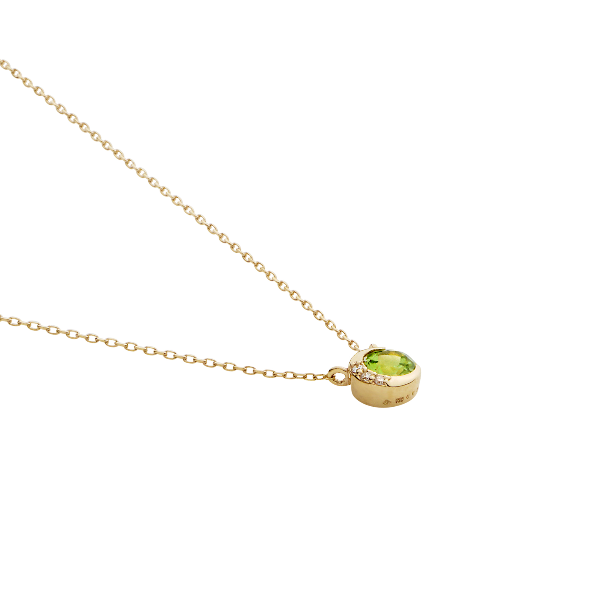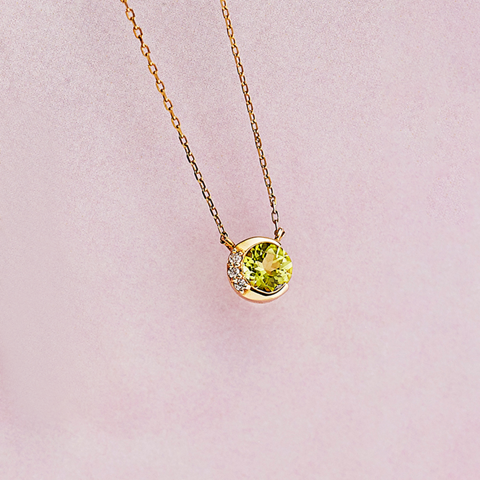 草原を思わせるような美しい黄緑色のペリドットに、三日月に留めたダイヤモンドが繊細な輝きをプラスします。