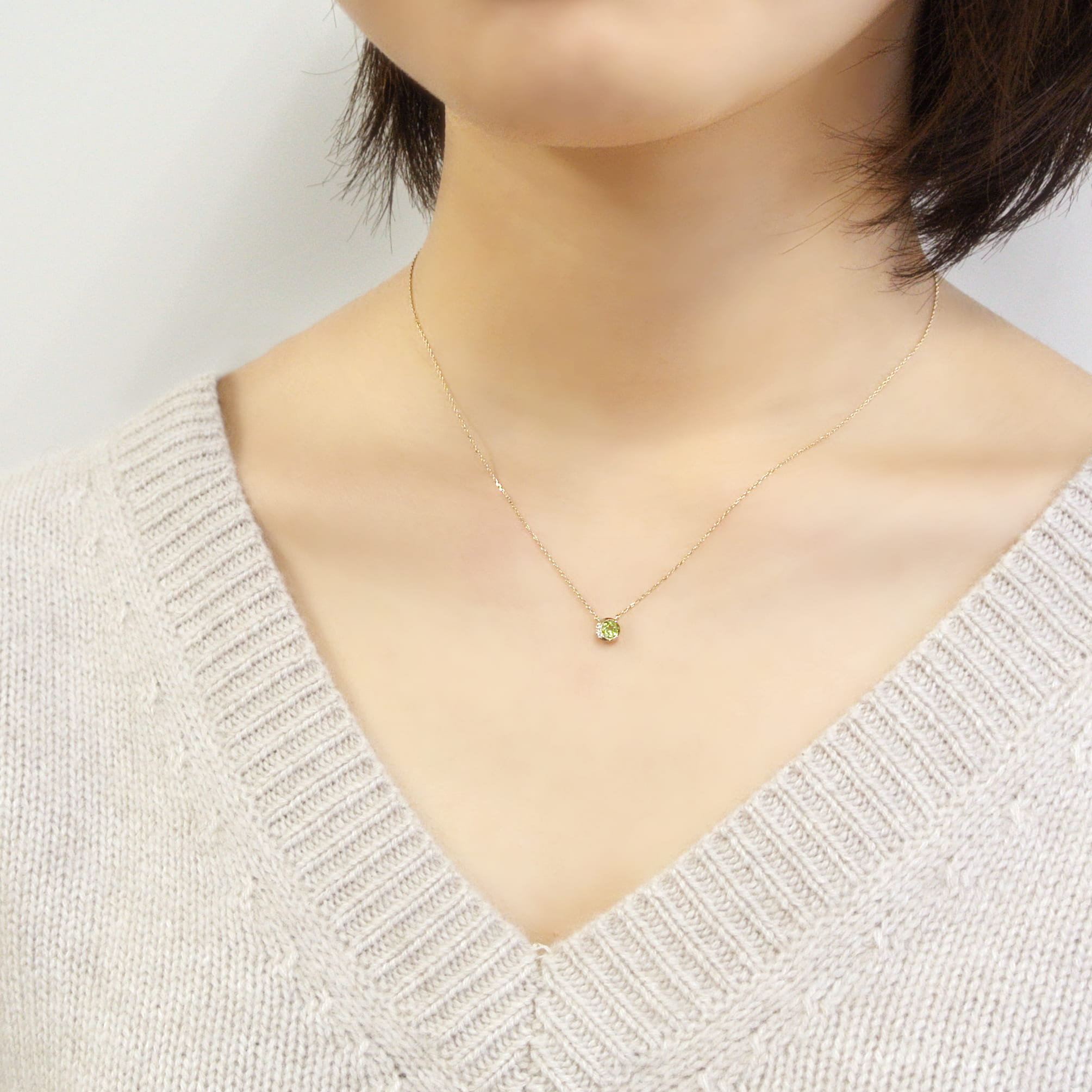 イエローゴールドの三日月でペリドットを留めたネックレス。