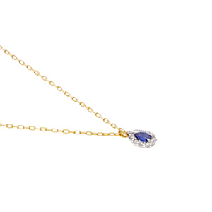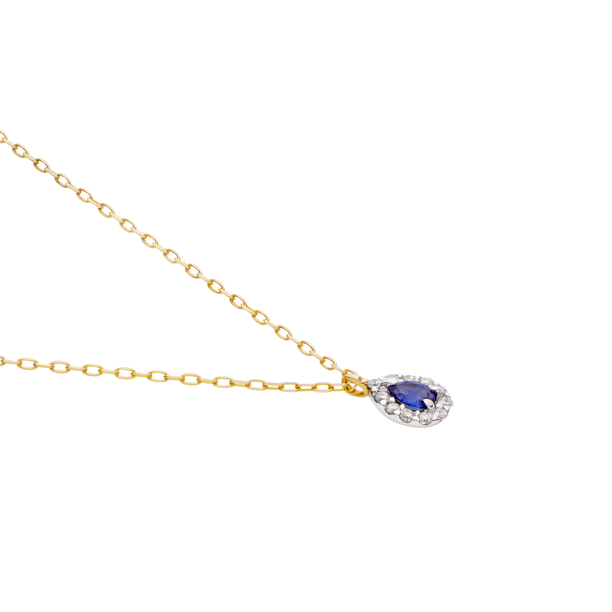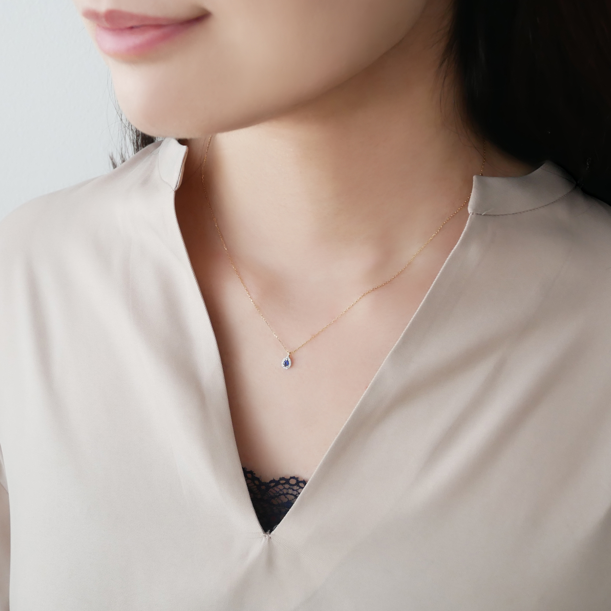 ペアシェイプカットのサファイアをダイヤモンドで取り巻いたネックレス。
