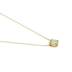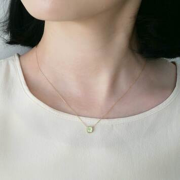 クッションカボションカットで表面をコロンと丸く、裏面にはカットを施し、ニュアンスを感じられるぼんやりとしたグリーンが、ムードを醸し出す印象的なネックレスに仕上げました。