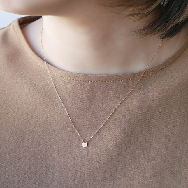 プレート状のネックレスはスキンジュエリーのように肌馴染み良く、優しい雰囲気で胸元を飾ります。