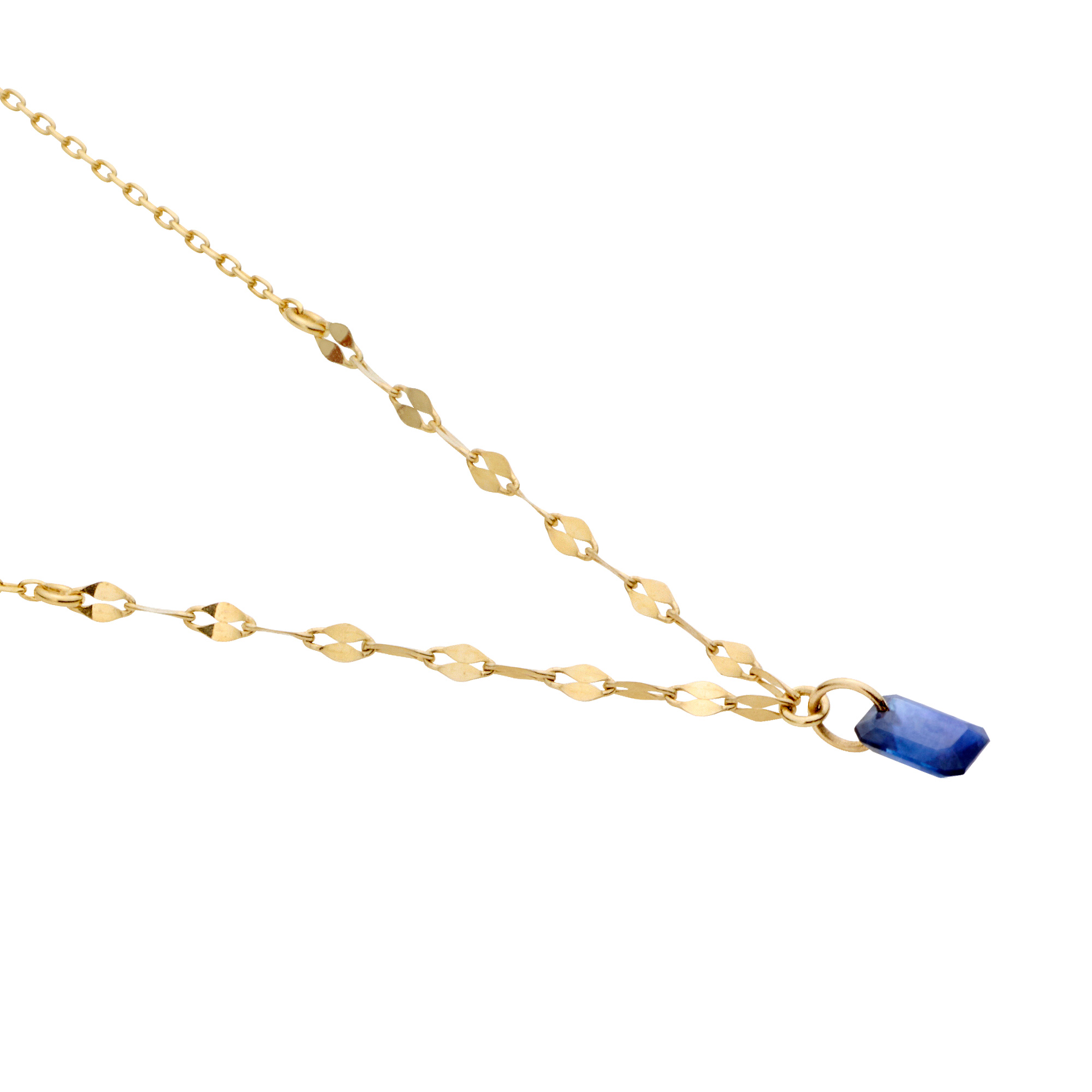 オクタゴンカットのサファイアに直接穴を開け、バチカンを通した軽やかな印象の仕上がり。