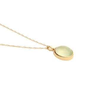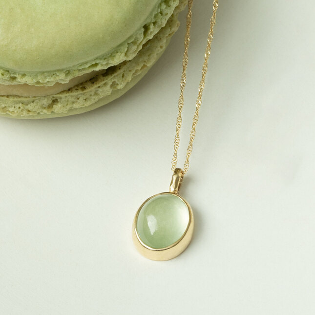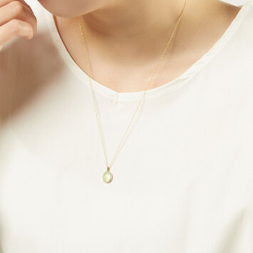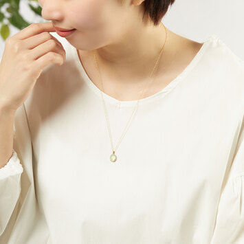 イエローゴールドの明るい輝きとプレーナイトの柔らかいグリーンの色味が、胸元に華やかさを添えます。