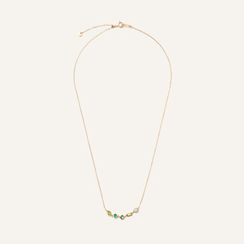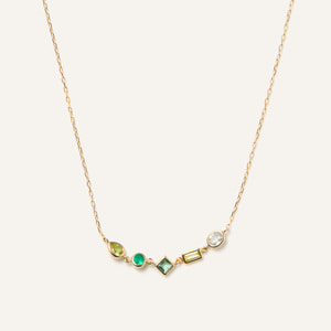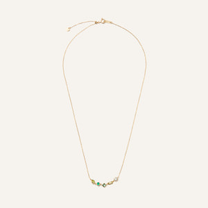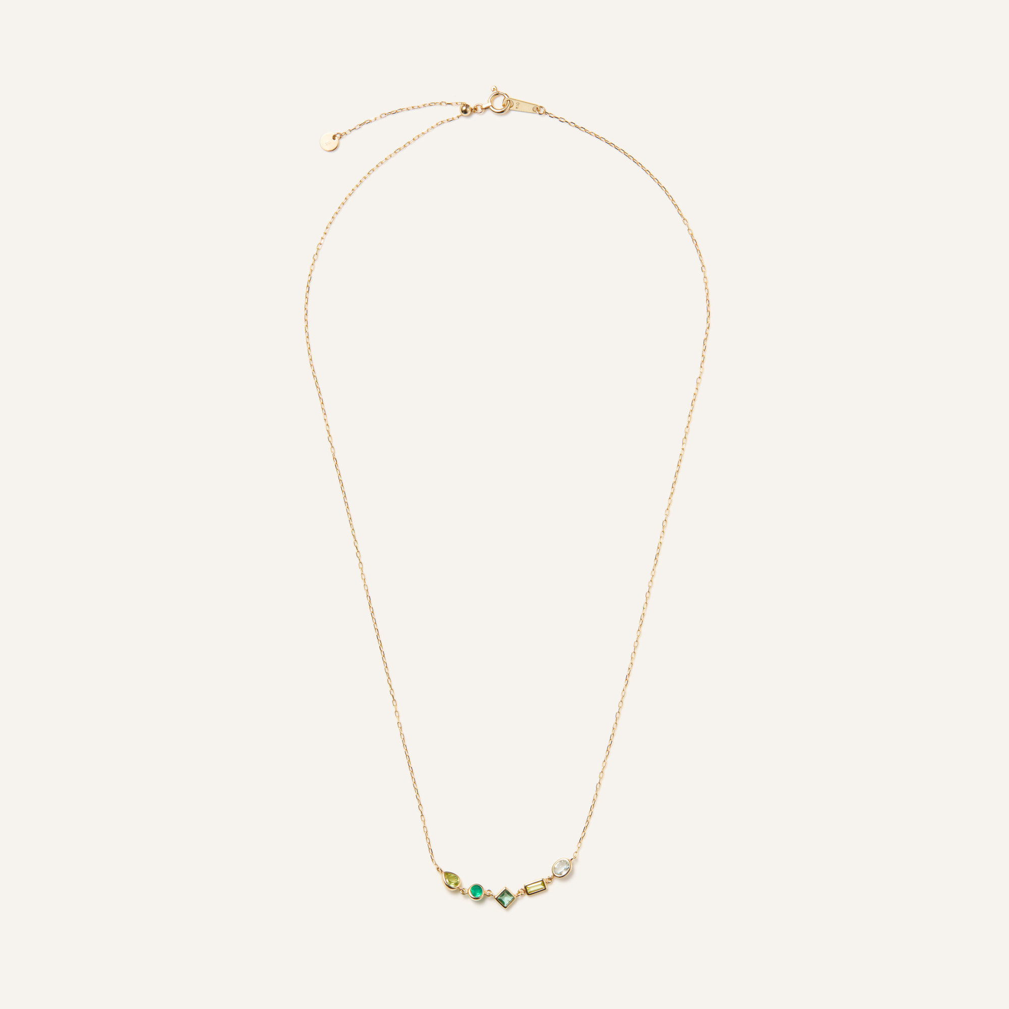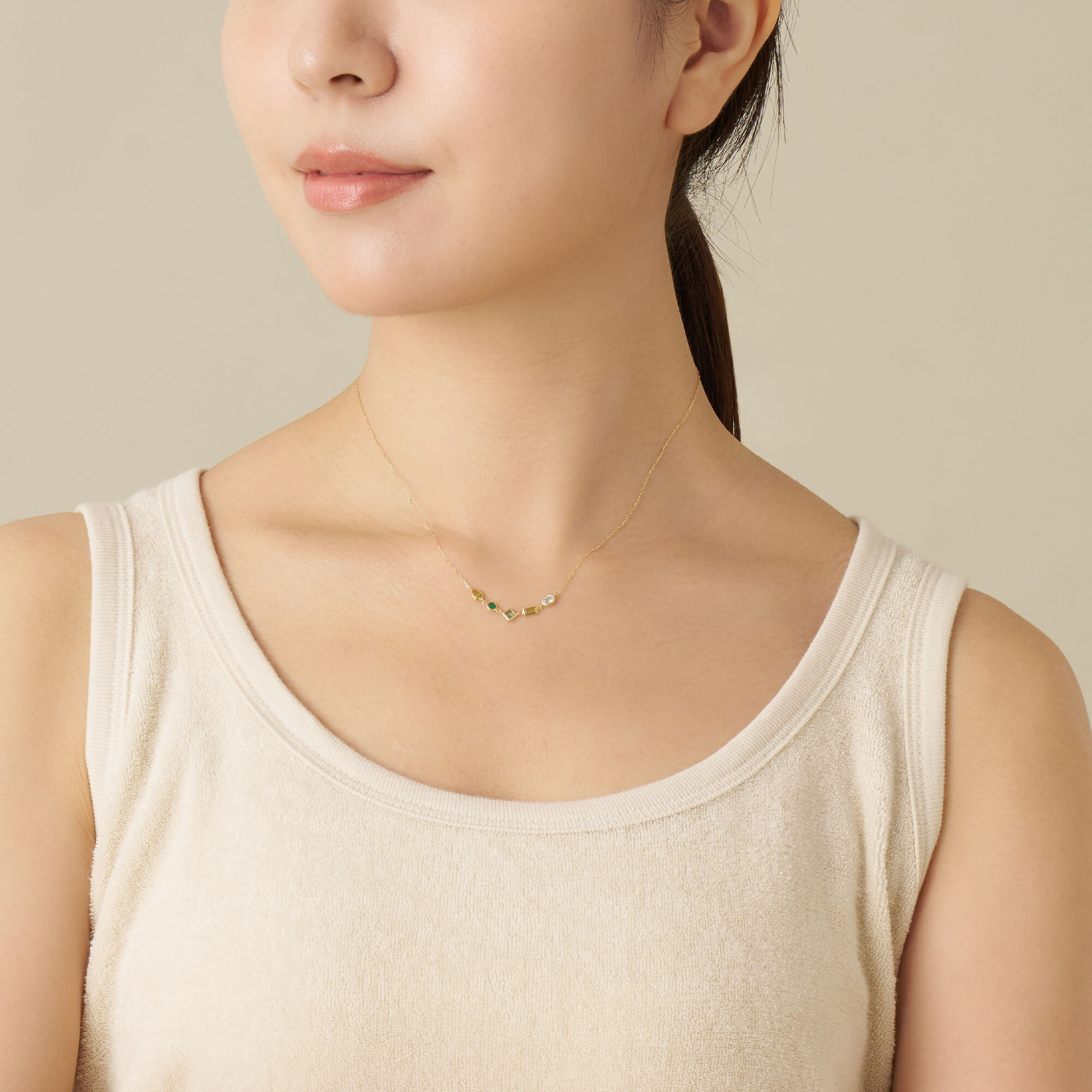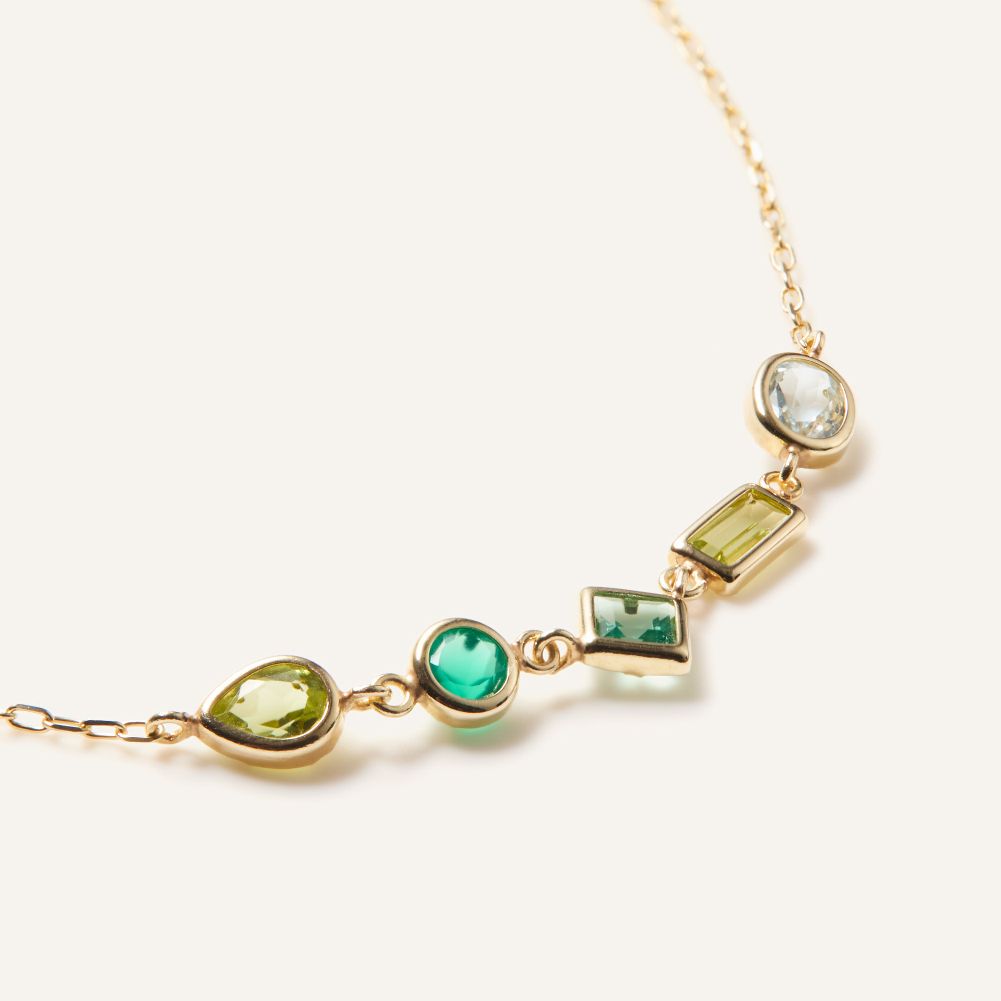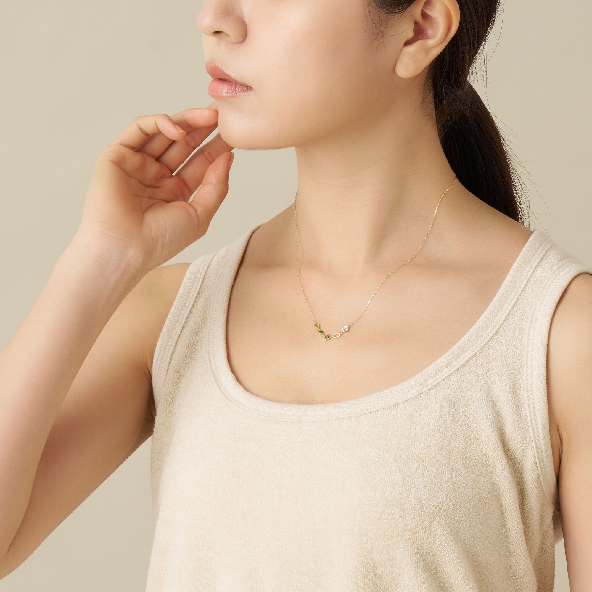 カラフルな宝石がまるでモザイクアートのようなジュエルモザイクシリーズ。 グリーンカラーを基調としたネックレス。 カラーストーンは4種類をミックスし、カットも多様な組み合わせ。 新芽のような瑞々しいグリーンカラーは、爽やかな印象を与えます。 透明感を感じられるカラーストーンは、細いゴールドのラインで囲われた石座にセッティング。 地金でキリッと縁取ることで、それぞれの石の輪郭を際立たせています。 少しシャープな印象もプラスされ、甘くなりすぎない仕上がりに。 スライドアジャスターなので、お好みによりチェーンの長さを細かく調整できます。▼カラーバリエーションはこちら▼ジュエルモザイクシリーズはこちら▼ブルートパーズのアイテムはこちら▼8月の誕生石 ペリドットのアイテムはこちら
