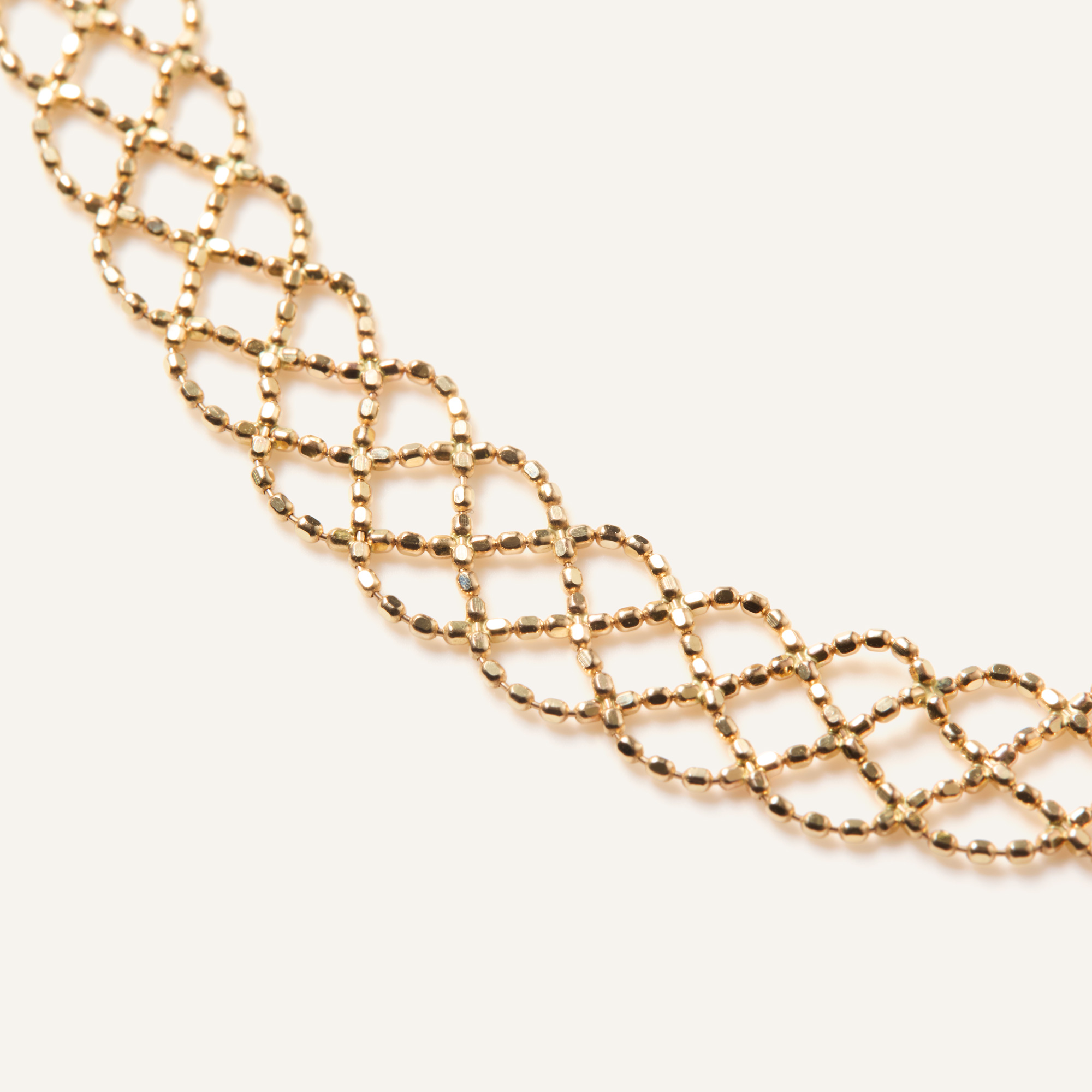カットボールチェーンをシンメトリーに編み込んだデザインは、職人の高度な技術が光ります。