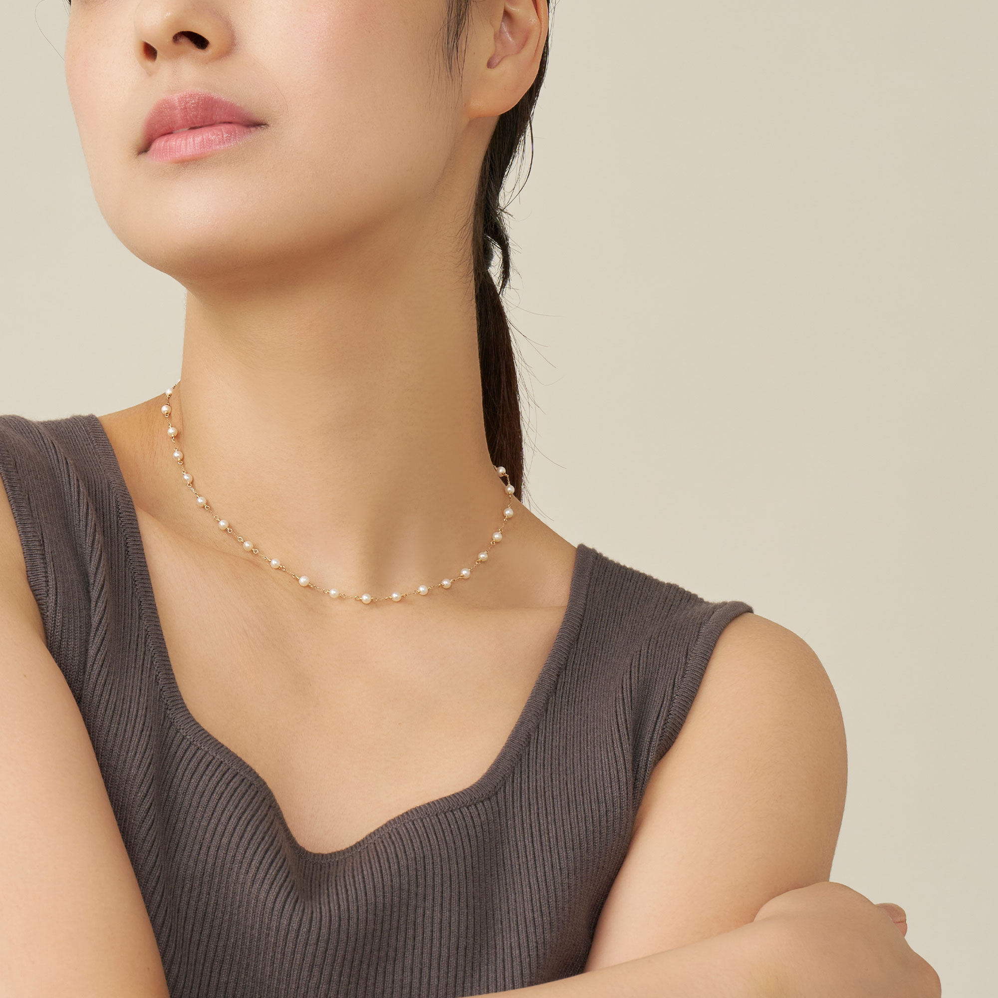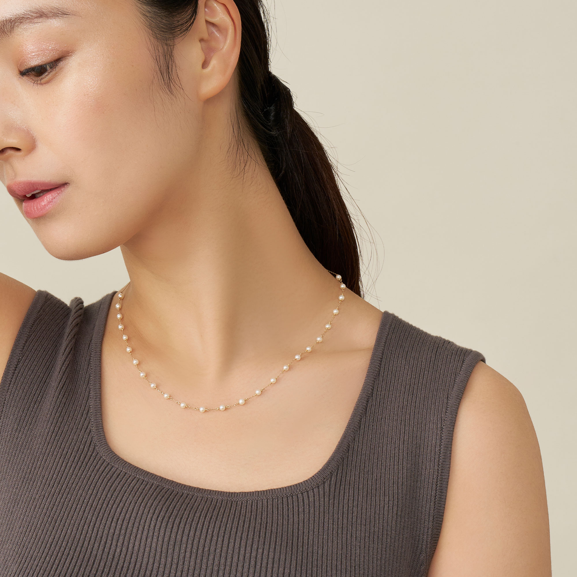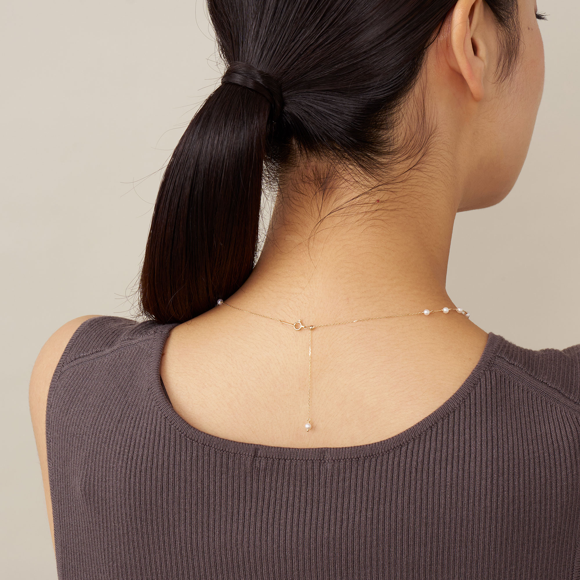 淡水パールのまろやかな輝きとチェーンの繊細なきらめきが美しいステーションネックレス。