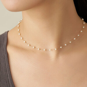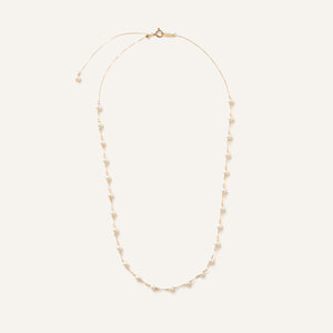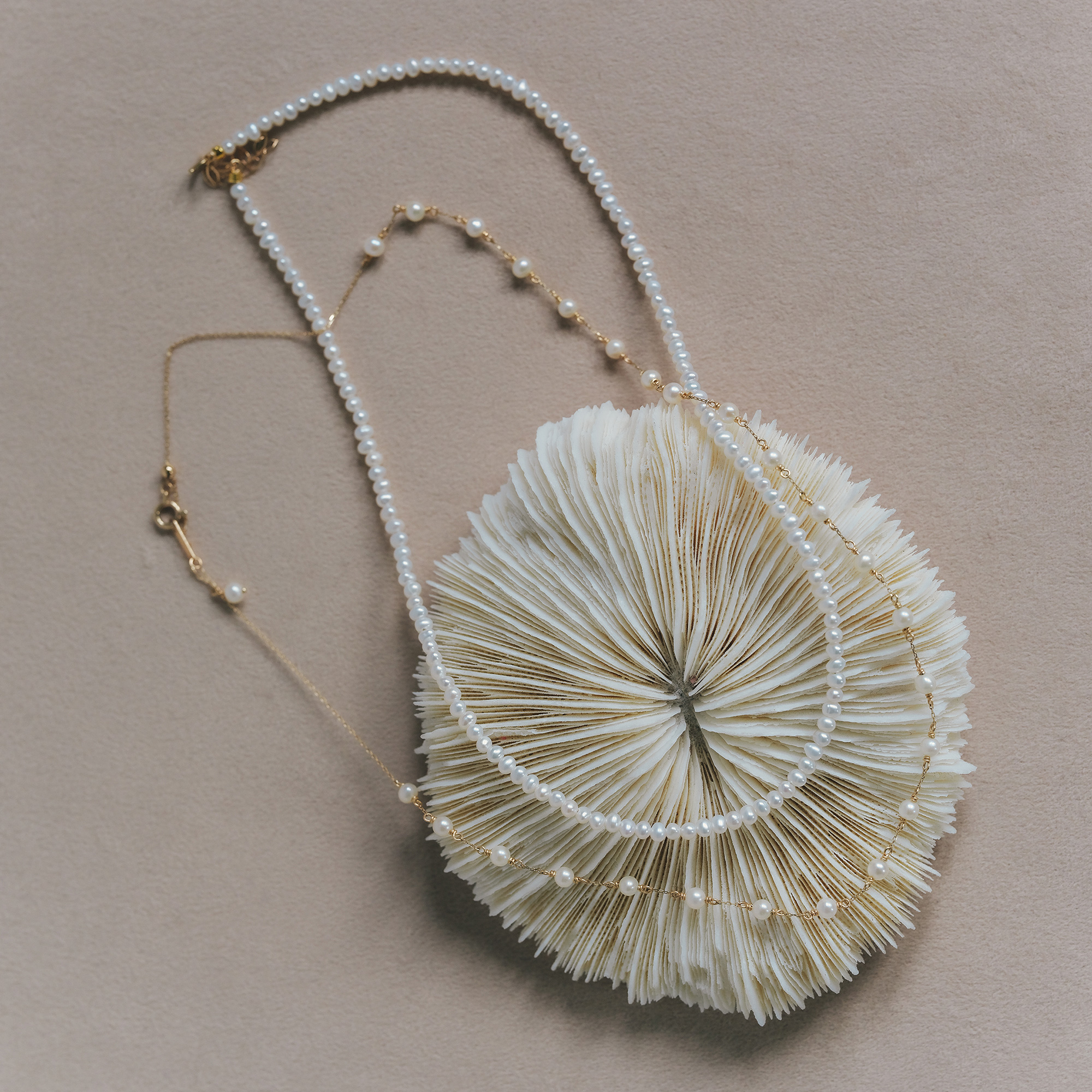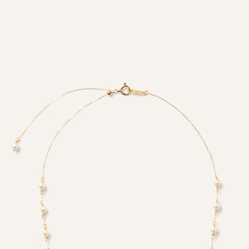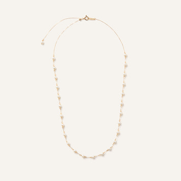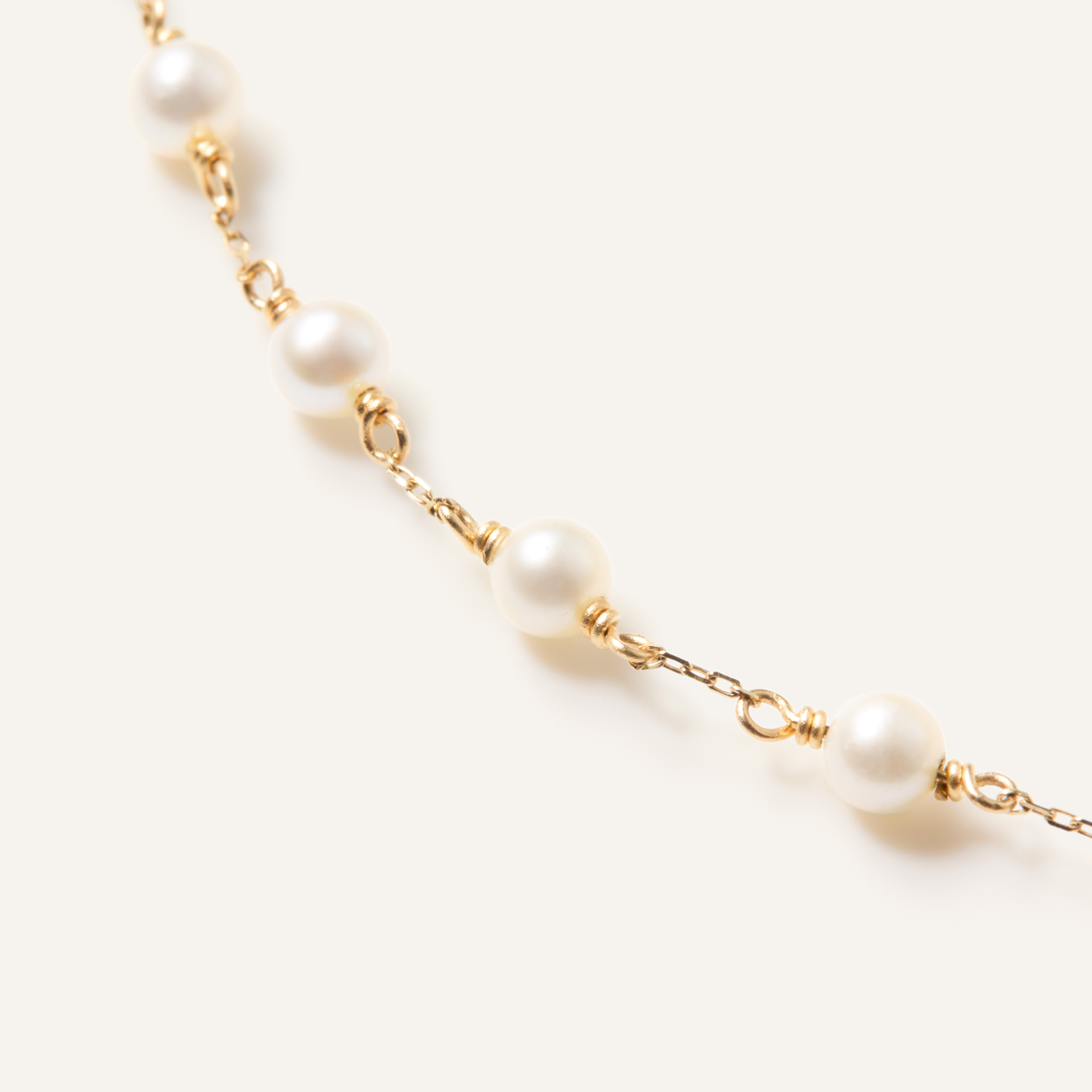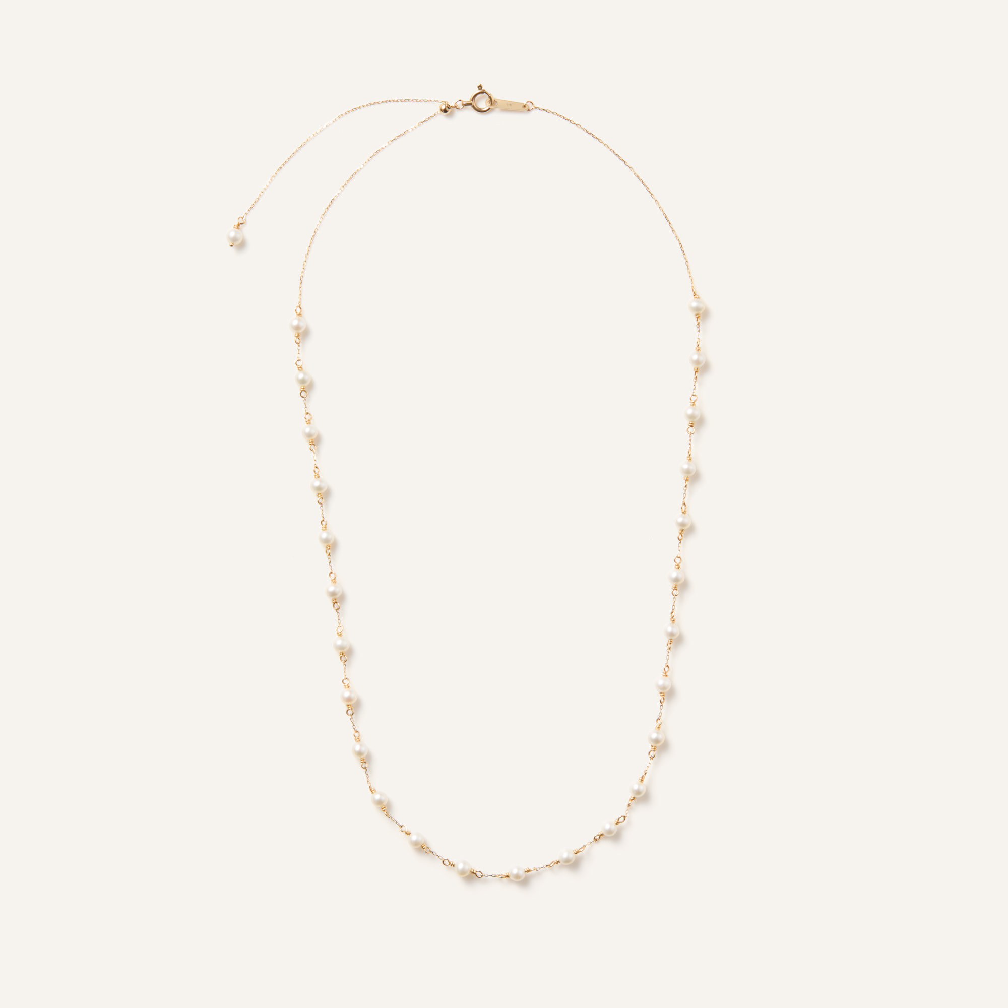 淡水パールのまろやかな輝きとチェーンの繊細なきらめきが美しいステーションネックレス。