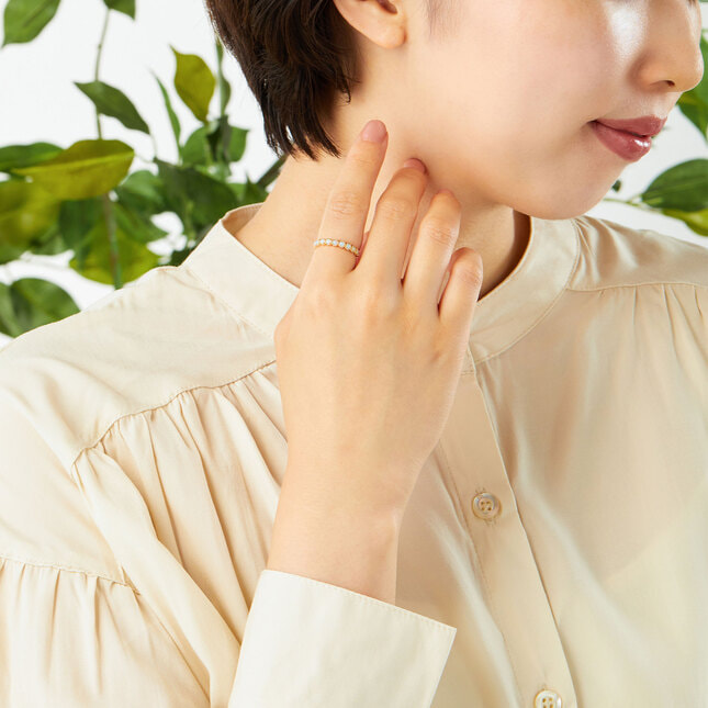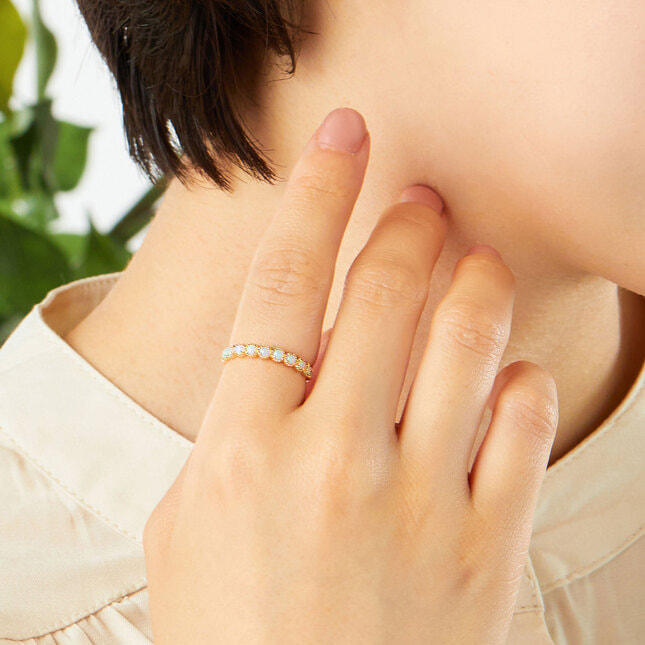 人気のハーフエタニティのデザインで並んだオパールは、一つ一つ微妙に表情の違う輝きが魅力的。