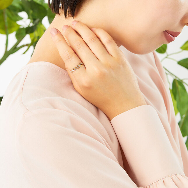 優しいカーブにさりげなく輝くメレダイヤが、いつものコーディネートを大人っぽく見せてくれそう。